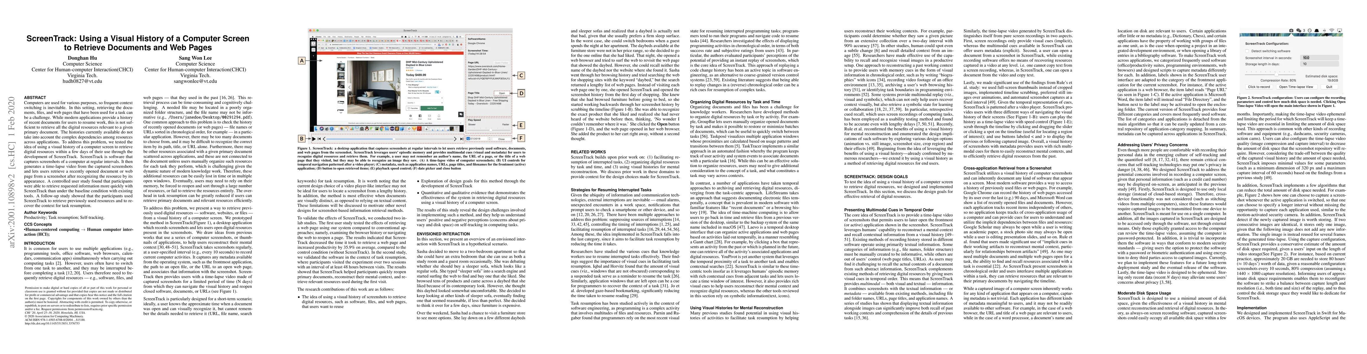 The research introduces ScreenTrack, software that captures screenshots at intervals, creating a time-lapse video of a computer screen. Users can retrieve resources from these screenshots. Studies show ScreenTrack aids quicker retrieval of requested information and supports task resumption, outperforming existing tools.