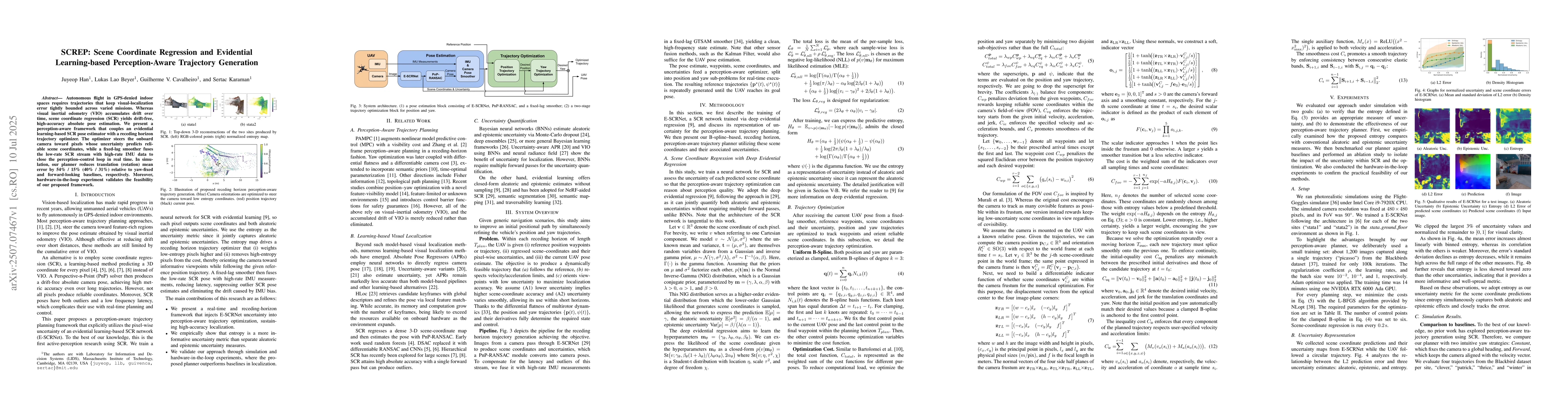 Autonomous flight in GPS denied indoor spaces requires trajectories that keep visual localization error tightly bounded across varied missions. Whereas visual inertial odometry (VIO) accumulates drift over time, scene coordinate regression (SCR) yields drift-free, high accuracy absolute pose estimation. We present a perception-aware framework that couples an evidential learning-based SCR pose estimator with a receding horizon trajectory optimizer. The optimizer steers the onboard camera toward pixels whose uncertainty predicts reliable scene coordinates, while a fixed-lag smoother fuses the low rate SCR stream with high rate IMU data to close the perception control loop in real time. In simulation, our planner reduces translation (rotation) mean error by 54% / 15% (40% / 31%) relative to yaw fixed and forward-looking baselines, respectively. Moreover, hardware in the loop experiment validates the feasibility of our proposed framework.
