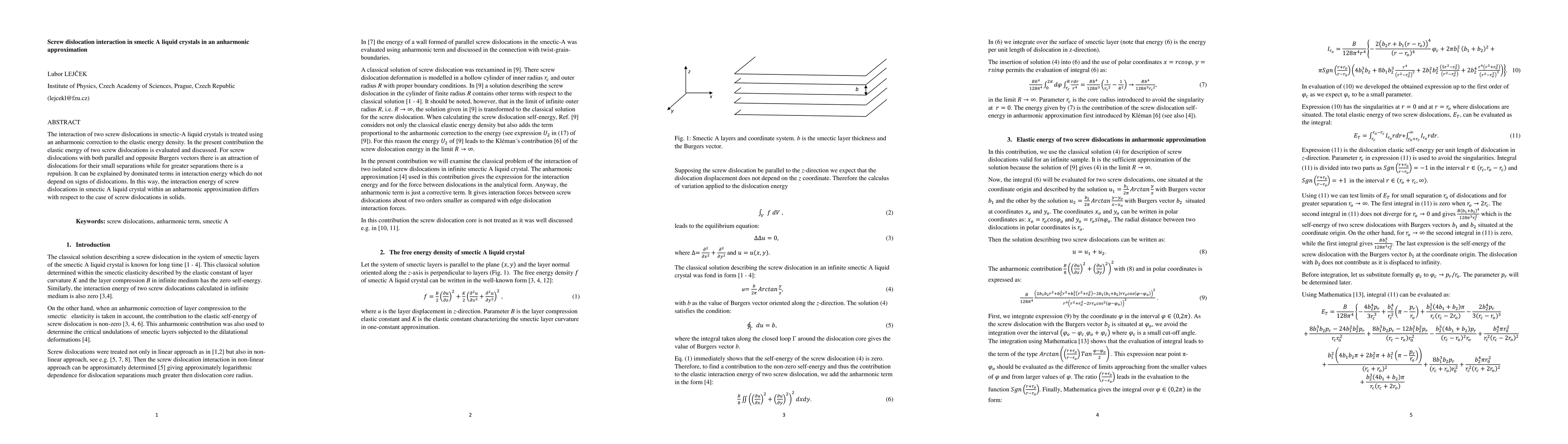 This paper evaluates the interaction between screw dislocations in smectic-A liquid crystals using an anharmonic elastic energy model, finding that small separations lead to attraction while larger separations result in repulsion, differing from solid dislocation behavior.