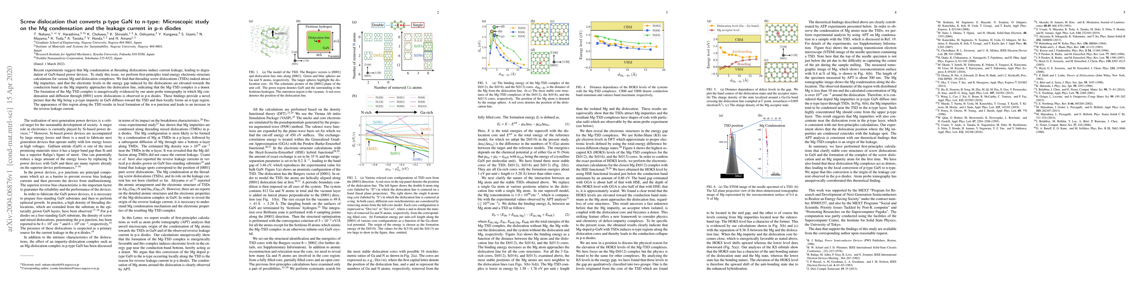 Recent experiments suggest that Mg condensation at threading dislocations induce current leakage, leading to degradation of GaN-based power devices. To study this issue, we perform first-principles total-energy electronic-structure calculations for various Mg and dislocation complexes. We find that threading screw dislocations (TSDs) indeed attract Mg impurities, and that the electronic levels in the energy gap induced by the dislocations are elevated towards the conduction band as the Mg impurity approaches the dislocation line, indicating that the Mg-TSD complex is a donor. The formation of the Mg-TSD complex is unequivocally evidenced by our atom probe tomography in which Mg condensation and diffusion through [0001] screw dislocations is observed in p-n diodes. These findings provide a novel picture that the Mg being a p-type impurity in GaN diffuses toward the TSD and then locally forms an n-type region. The appearance of this region along the TSD results the reverse leakage current.