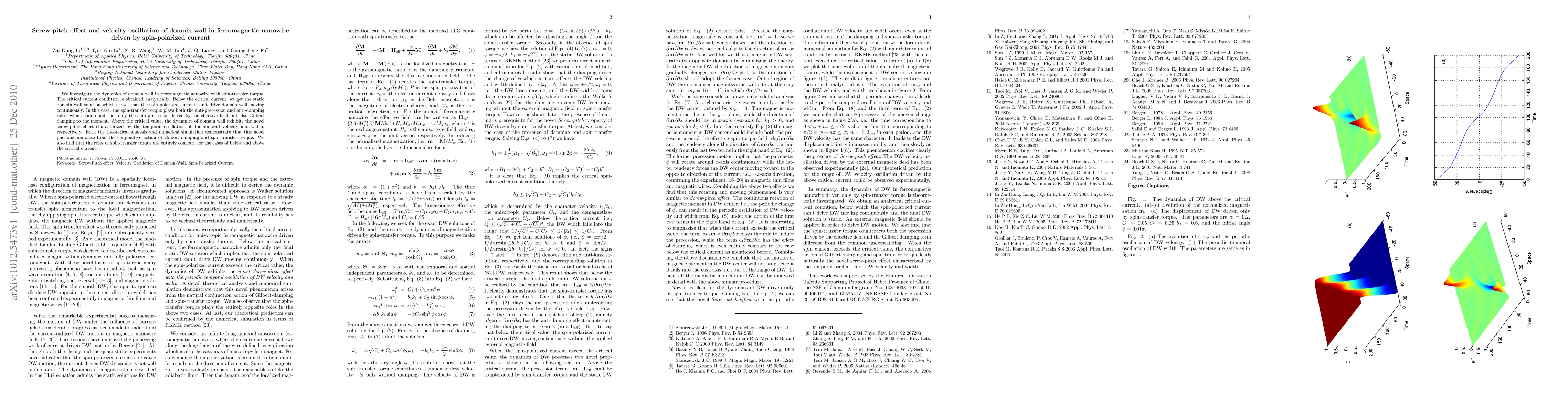 This paper investigates the dynamics of a domain wall in a ferromagnetic nanowire driven by spin-polarized current, revealing the screw-pitch effect above a critical current. Below this threshold, spin-transfer torque prevents continuous domain wall motion, while above it, the domain wall exhibits temporal oscillations in velocity and width due to the interplay of Gilbert-damping and spin-transfer torque.