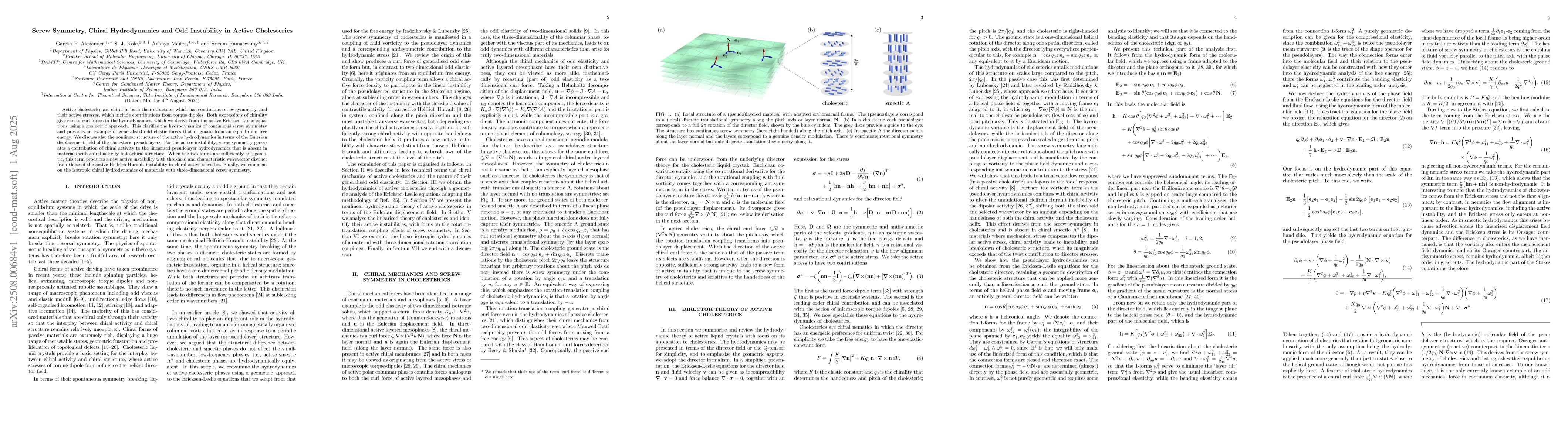 Active cholesterics are chiral in both their structure, which has continuous screw symmetry, and their active stresses, which include contributions from torque dipoles. Both expressions of chirality give rise to curl forces in the hydrodynamics, which we derive from the active Ericksen-Leslie equations using a geometric approach. This clarifies the hydrodynamics of continuous screw symmetry and provides an example of generalised odd elastic forces that originate from an equilibrium free energy. We discuss also the nonlinear structure of the active hydrodynamics in terms of the Eulerian displacement field of the cholesteric pseudolayers. For the active instability, screw symmetry generates a contribution of chiral activity to the linearised pseudolayer hydrodynamics that is absent in materials with chiral activity but achiral structure. When the two forms are sufficiently antagonistic, this term produces a new active instability with threshold and characteristic wavevector distinct from those of the active Helfrich-Hurault instability in chiral active smectics. Finally, we comment on the isotropic chiral hydrodynamics of materials with three-dimensional screw symmetry.