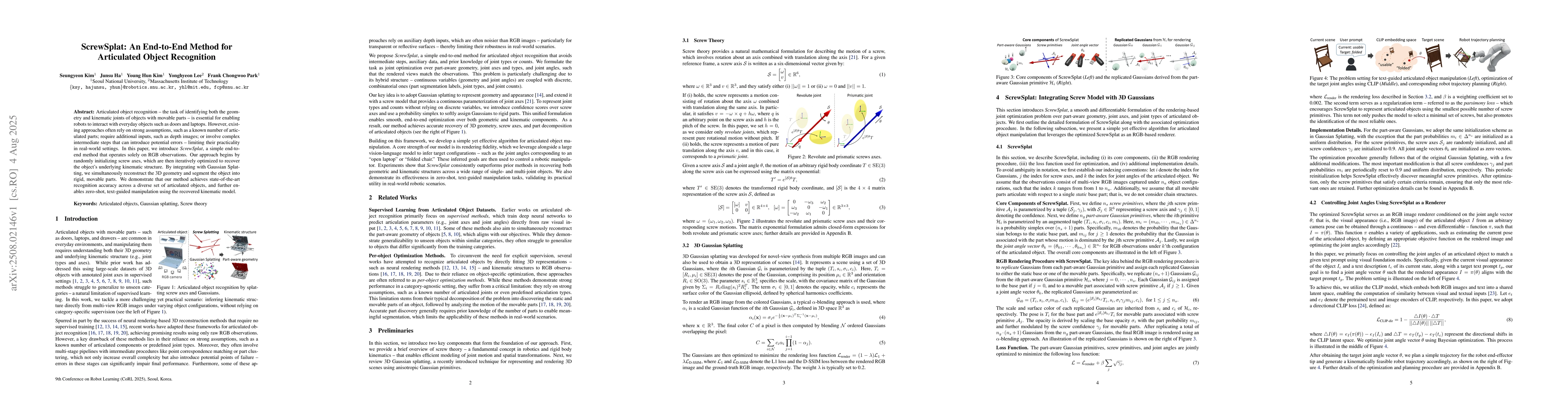 Articulated object recognition -- the task of identifying both the geometry and kinematic joints of objects with movable parts -- is essential for enabling robots to interact with everyday objects such as doors and laptops. However, existing approaches often rely on strong assumptions, such as a known number of articulated parts; require additional inputs, such as depth images; or involve complex intermediate steps that can introduce potential errors -- limiting their practicality in real-world settings. In this paper, we introduce ScrewSplat, a simple end-to-end method that operates solely on RGB observations. Our approach begins by randomly initializing screw axes, which are then iteratively optimized to recover the object's underlying kinematic structure. By integrating with Gaussian Splatting, we simultaneously reconstruct the 3D geometry and segment the object into rigid, movable parts. We demonstrate that our method achieves state-of-the-art recognition accuracy across a diverse set of articulated objects, and further enables zero-shot, text-guided manipulation using the recovered kinematic model.