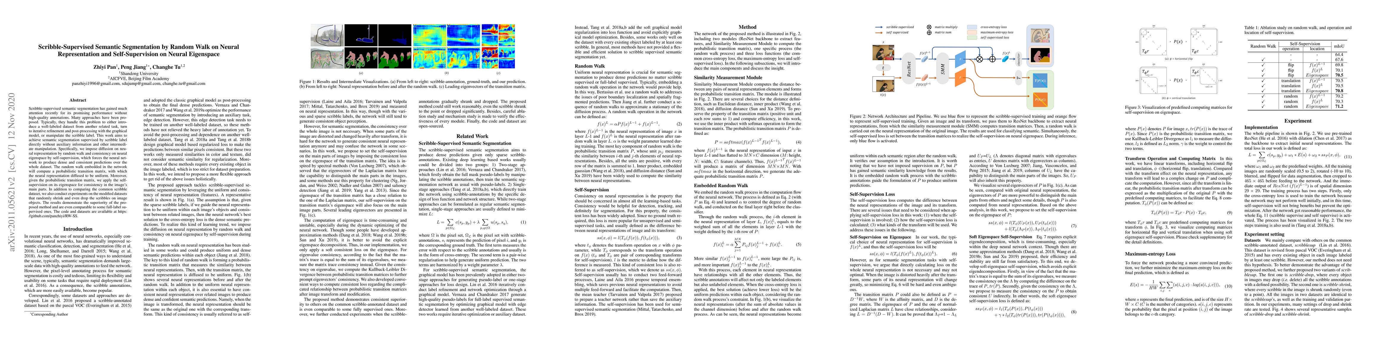This paper proposes a method for scribble-supervised semantic segmentation using random walk on neural representation and self-supervision on neural eigenspace, achieving dense and consistent predictions without auxiliary datasets or intermediate manipulations. Experiments show superior performance compared to full-label supervised methods, even when scribbles are reduced.