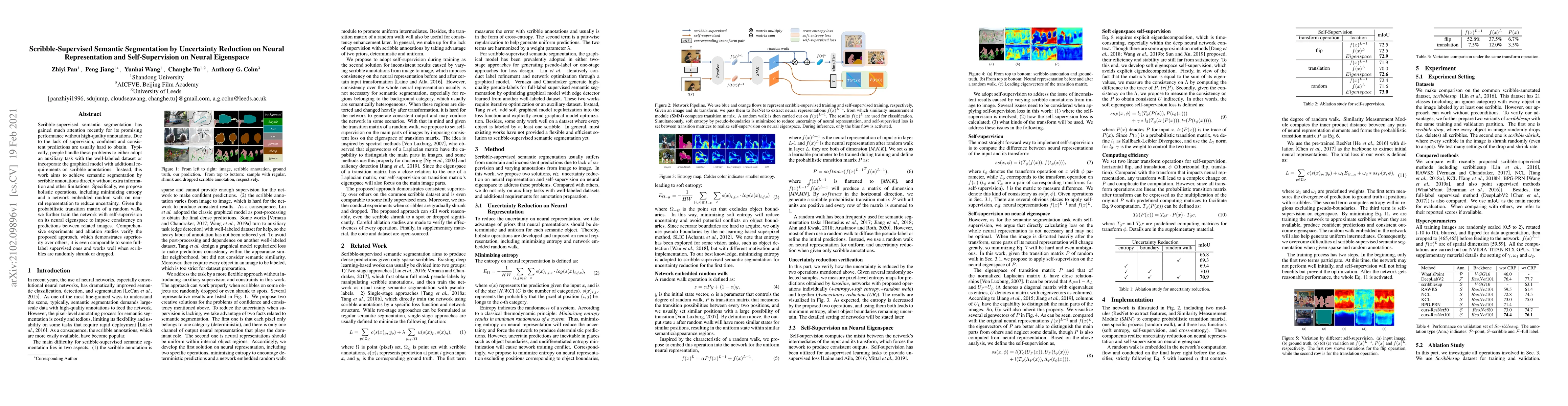 This paper proposes a method for scribble-supervised semantic segmentation that reduces uncertainty through entropy minimization and neural representation random walks, and enhances consistency via self-supervision on neural eigenspace. Experiments show the method's effectiveness, comparable to fully supervised approaches, even with reduced or missing scribble annotations.