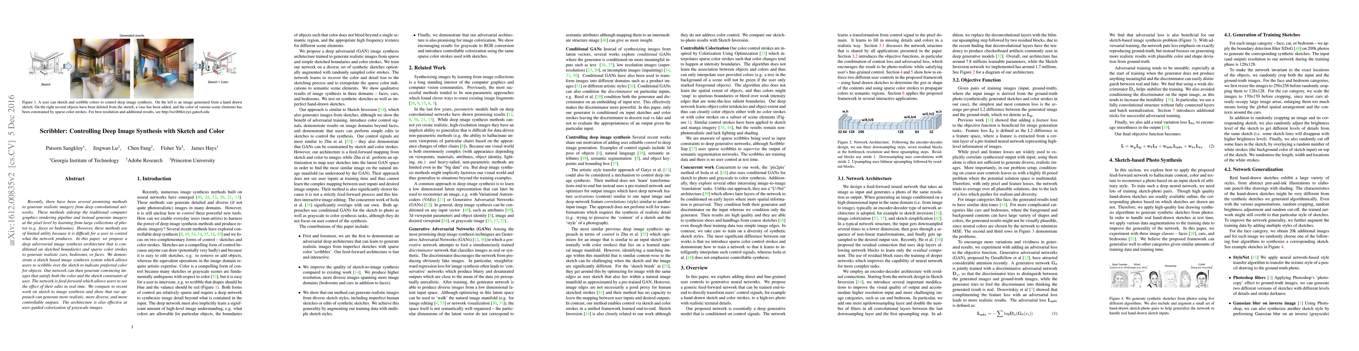 This paper introduces Scribbler, a deep adversarial image synthesis system that generates realistic images conditioned on sketched boundaries and color strokes. The network allows users to control the output by scribbling preferred colors, producing more realistic, diverse, and controllable results compared to existing methods.