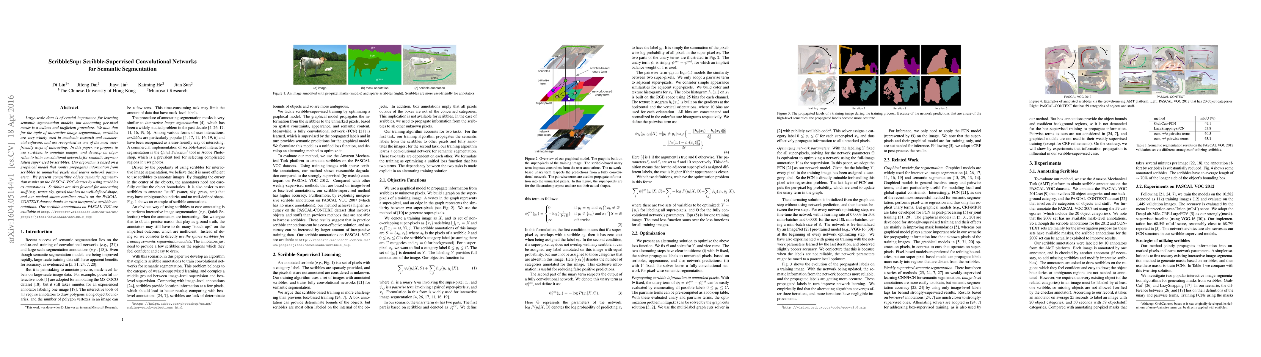 This paper proposes ScribbleSup, a method to train convolutional networks for semantic segmentation using scribble annotations instead of tedious per-pixel masks. The algorithm leverages scribbles to propagate information and learn network parameters, achieving competitive results on the PASCAL VOC dataset and showing excellent performance on the PASCAL-CONTEXT dataset.