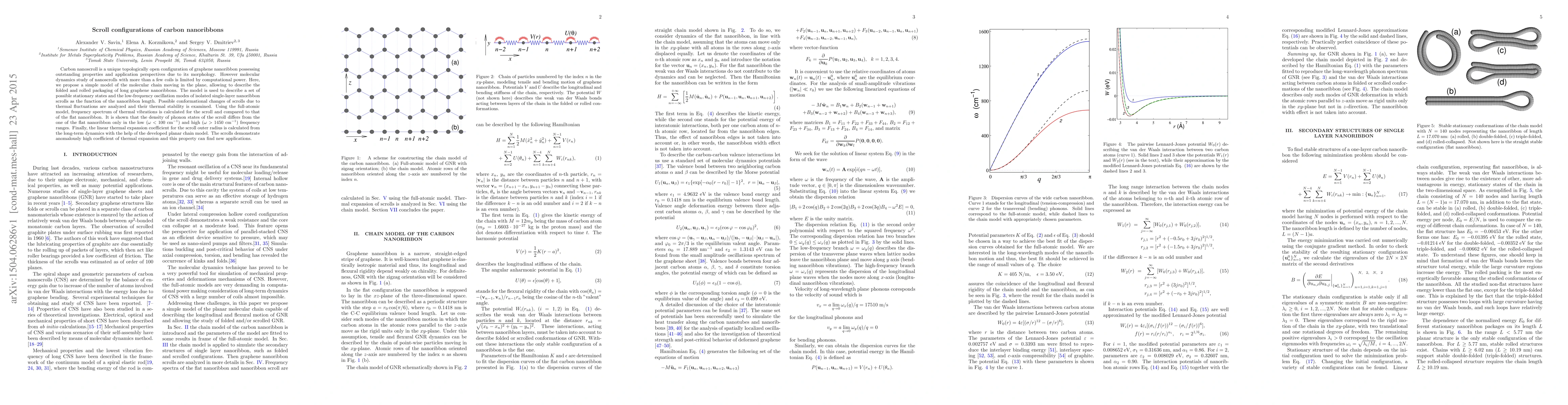 Carbon nanoscroll is a unique topologically open configuration of graphene nanoribbon possessing outstanding properties and application perspectives due to its morphology. However molecular dynamics study of nanoscrolls with more than a few coils is limited by computational power. Here, we propose a simple model of the molecular chain moving in the plane, allowing to describe the folded and rolled packaging of long graphene nanoribbons. The model is used to describe a set of possible stationary states and the low-frequency oscillation modes of isolated single-layer nanoribbon scrolls as the function of the nanoribbon length. Possible conformational changes of scrolls due to thermal fluctuations are analyzed and their thermal stability is examined. Using the full-atomic model, frequency spectrum of thermal vibrations is calculated for the scroll and compared to that of the flat nanoribbon. It is shown that the density of phonon states of the scroll differs from the one of the flat nanoribbon only in the low (omega<100 cm-1) and high (omega>1450 cm-1) frequency ranges. Finally, the linear thermal expansion coefficient for the scroll outer radius is calculated from the long-term dynamics with the help of the developed planar chain model. The scrolls demonstrate anomalously high coefficient of thermal expansion and this property can find new applications.