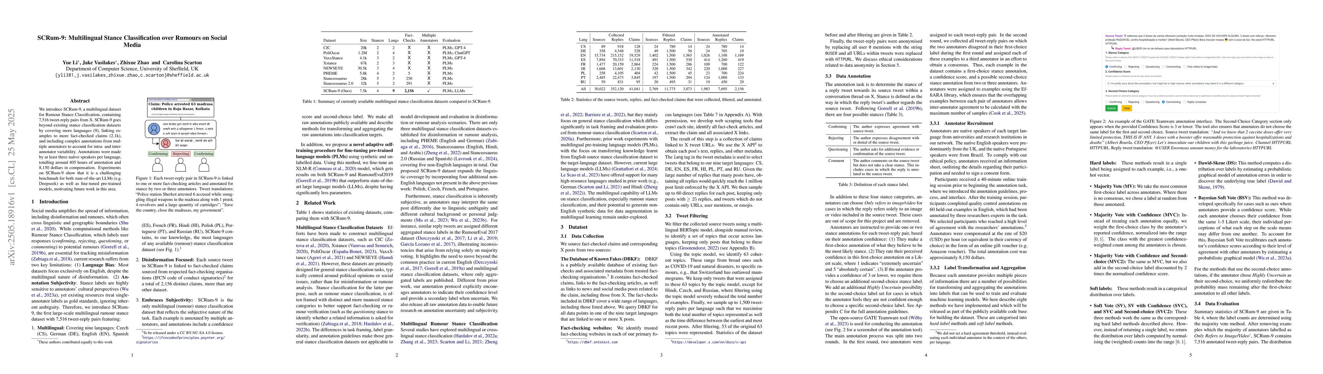 SCRum-9, a multilingual dataset for Rumour Stance Classification, with complex annotations and links to fact-checked claims.