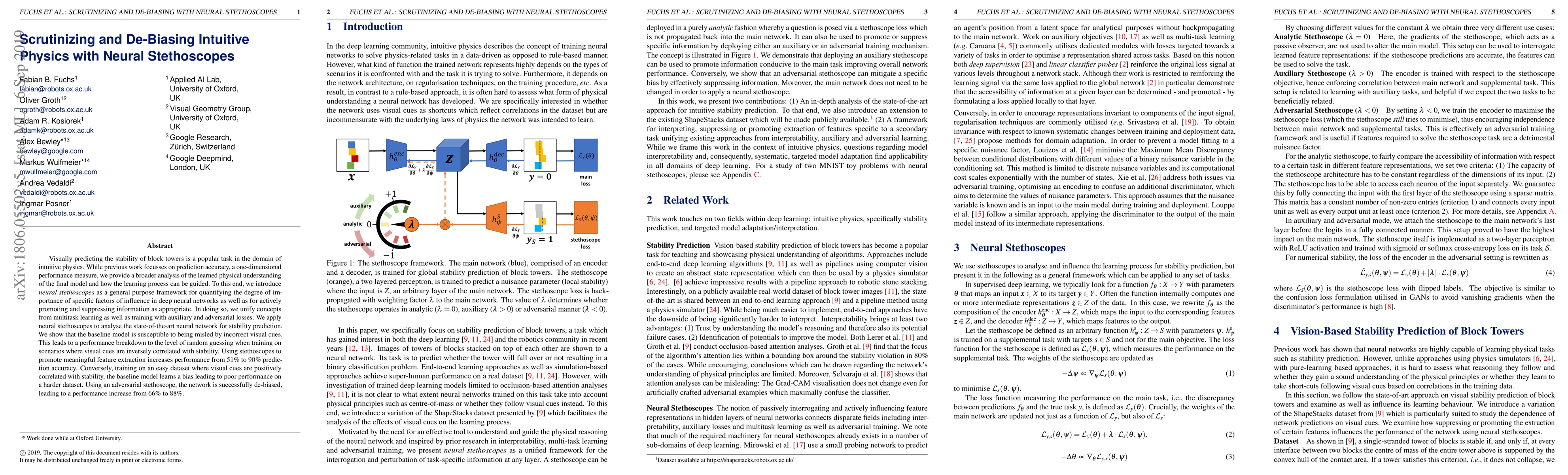 Visually predicting the stability of block towers is a popular task in the domain of intuitive physics. While previous work focusses on prediction accuracy, a one-dimensional performance measure, we provide a broader analysis of the learned physical understanding of the final model and how the learning process can be guided. To this end, we introduce neural stethoscopes as a general purpose framework for quantifying the degree of importance of specific factors of influence in deep neural networks as well as for actively promoting and suppressing information as appropriate. In doing so, we unify concepts from multitask learning as well as training with auxiliary and adversarial losses. We apply neural stethoscopes to analyse the state-of-the-art neural network for stability prediction. We show that the baseline model is susceptible to being misled by incorrect visual cues. This leads to a performance breakdown to the level of random guessing when training on scenarios where visual cues are inversely correlated with stability. Using stethoscopes to promote meaningful feature extraction increases performance from 51% to 90% prediction accuracy. Conversely, training on an easy dataset where visual cues are positively correlated with stability, the baseline model learns a bias leading to poor performance on a harder dataset. Using an adversarial stethoscope, the network is successfully de-biased, leading to a performance increase from 66% to 88%.