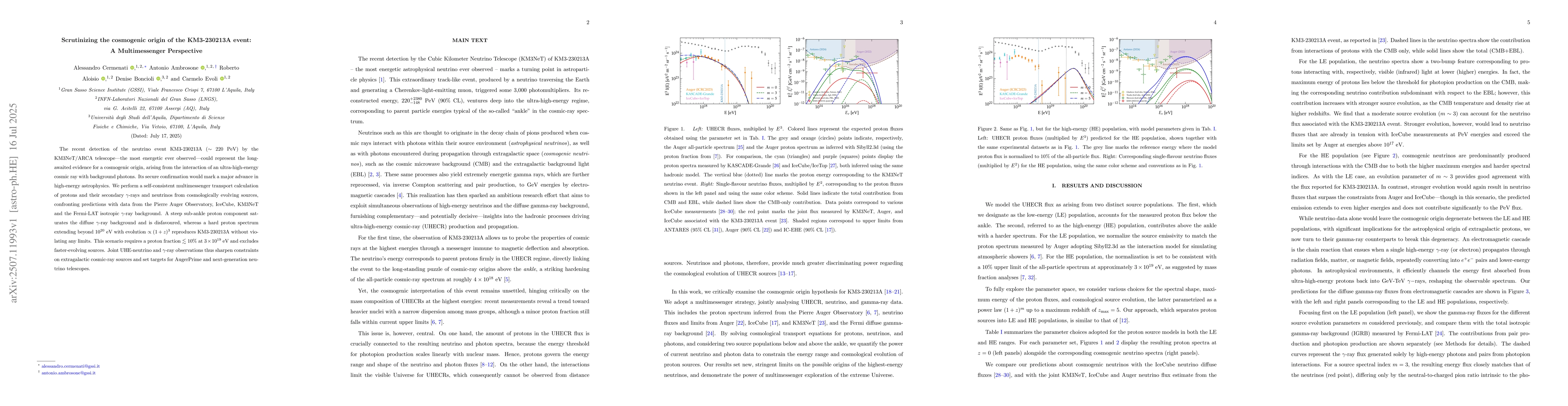 The recent detection of the neutrino event KM3-230213A ($\sim$~220 PeV) by the KM3NeT/ARCA telescope, the most energetic ever observed, could represent the long-awaited evidence for a cosmogenic origin, arising from the interaction of an ultra-high-energy cosmic ray with background photons. Its secure confirmation would mark a major advance in high-energy astrophysics. We perform a self-consistent multimessenger transport calculation of protons and their secondary $\gamma$-rays and neutrinos from cosmologically evolving sources, confronting predictions with data from the Pierre Auger Observatory, IceCube, KM3NeT, and the Fermi-LAT isotropic $\gamma$-ray background. A steep sub-ankle proton component saturates the diffuse $\gamma$-ray background and is disfavoured, whereas a hard proton spectrum extending beyond $10^{20}$~eV with evolution $\propto (1+z)^3$ reproduces KM3-230213A without violating any limits. This scenario requires a proton fraction $\lesssim 10$\% at $3\times 10^{19}$~eV and excludes faster-evolving sources. Joint UHE-neutrino and $\gamma$-ray observations thus sharpen constraints on extragalactic cosmic-ray sources and set targets for AugerPrime and next-generation neutrino telescopes.