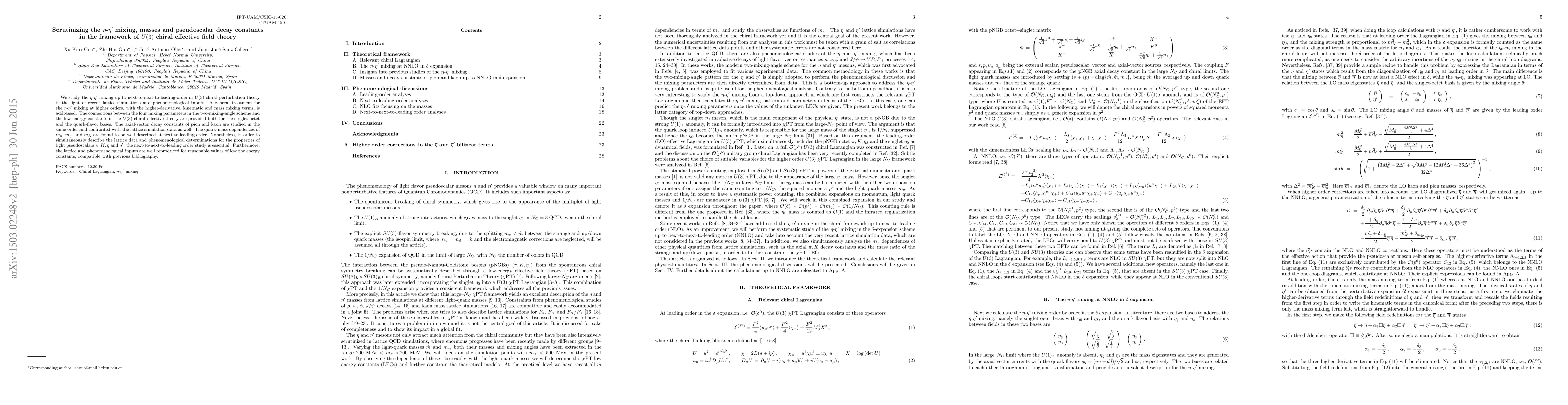 This paper investigates $\eta$-$\eta'$ mixing, masses, and pseudoscalar decay constants in U(3) chiral effective field theory, focusing on next-to-next-to-leading-order calculations. It establishes connections between mixing parameters and low energy constants, and finds that next-to-next-to-leading order is crucial for accurately describing lattice data and phenomenological results.