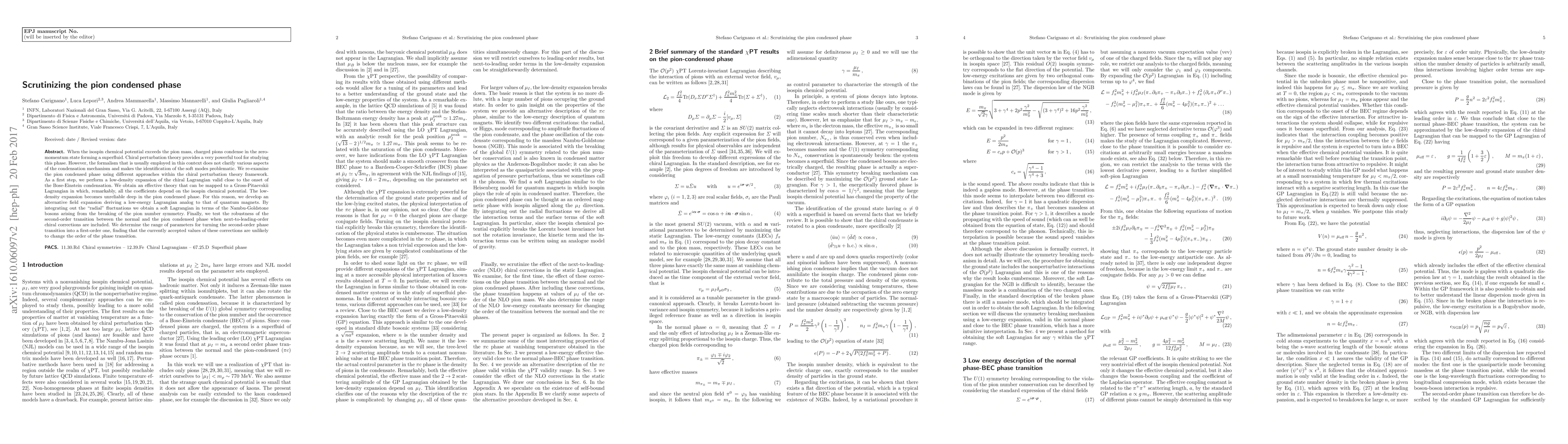 When the isospin chemical potential exceeds the pion mass, charged pions condense in the zero-momentum state forming a superfluid. Chiral perturbation theory provides a very powerful tool for studying this phase. However, the formalism that is usually employed in this context does not clarify various aspects of the condensation mechanism and makes the identification of the soft modes problematic. We re-examine the pion condensed phase using different approaches within the chiral perturbation theory framework. As a first step, we perform a low-density expansion of the chiral Lagrangian valid close to the onset of the Bose-Einstein condensation. We obtain an effective theory that can be mapped to a Gross-Pitaevskii Lagrangian in which, remarkably, all the coefficients depend on the isospin chemical potential. The low-density expansion becomes unreliable deep in the pion condensed phase. For this reason, we develop an alternative field expansion deriving a low-energy Lagrangian analog to that of quantum magnets. By integrating out the "radial" fluctuations we obtain a soft Lagrangian in terms of the Nambu-Goldstone bosons arising from the breaking of the pion number symmetry. Finally, we test the robustness of the second-order transition between the normal and the pion condensed phase when next-to-leading-order chiral corrections are included. We determine the range of parameters for turning the second-order phase transition into a first-order one, finding that the currently accepted values of these corrections are unlikely to change the order of the phase transition.