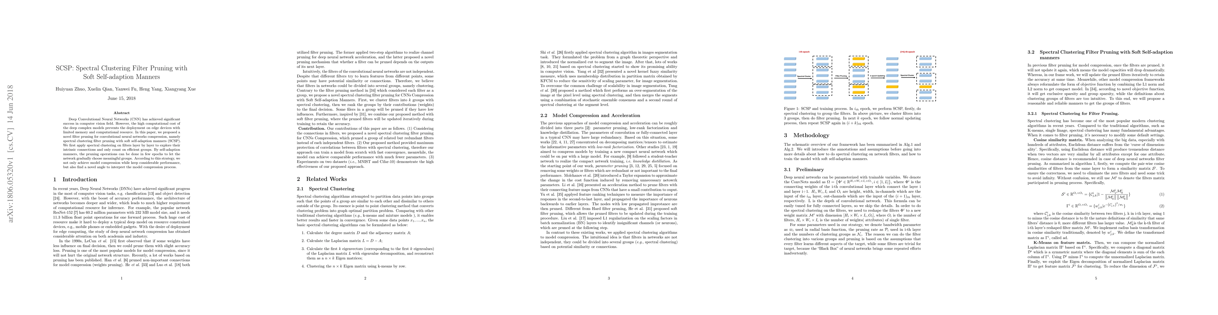The paper proposes SCSP, a novel filter pruning method for convolutional neural networks compression using spectral clustering and soft self-adaption manners. It applies spectral clustering layer-wise to explore filter connections and iteratively updates pruned filters to retain accuracy.