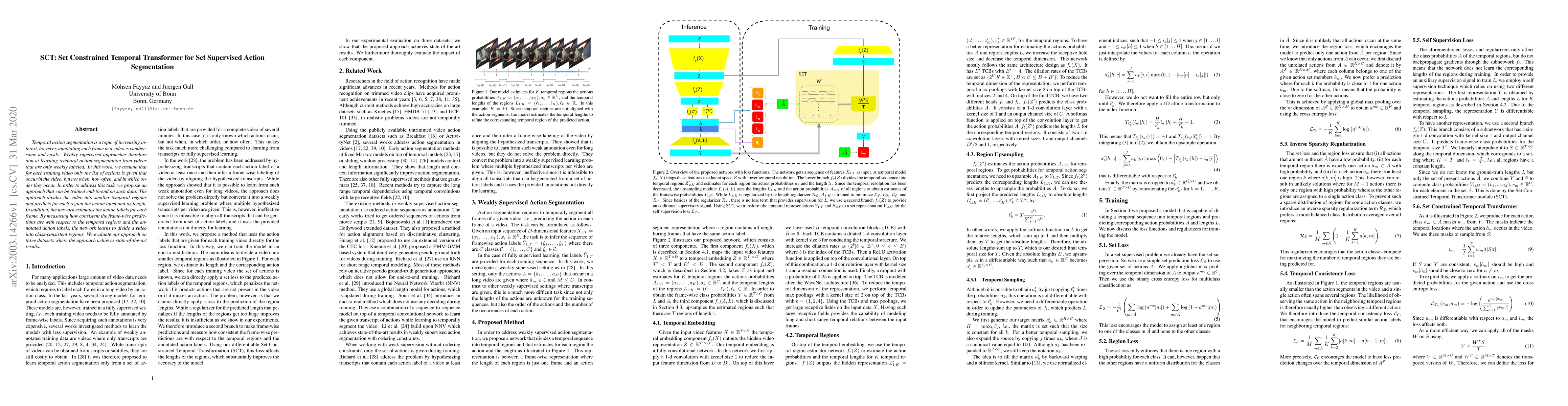 This paper introduces a Set Constrained Temporal Transformer (SCT) for weakly supervised temporal action segmentation, which predicts action labels and their durations for temporal regions in videos given only a list of actions. The model achieves state-of-the-art performance on three datasets by learning consistency between frame-wise predictions and temporal regions.