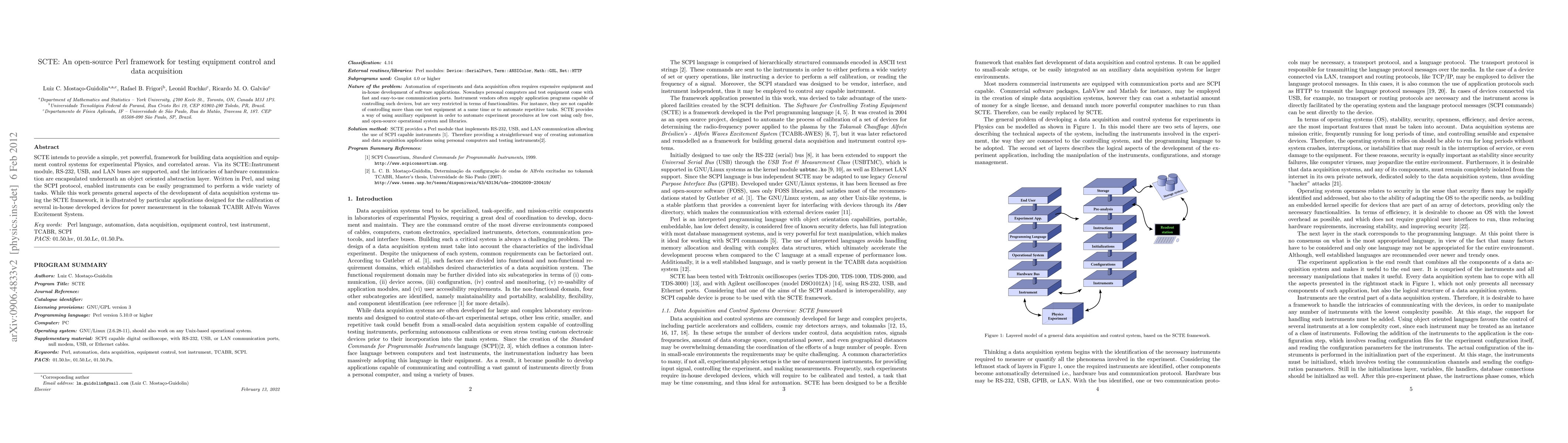 SCTE is an open-source Perl framework designed for data acquisition and equipment control in experimental physics, supporting RS-232, USB, and LAN buses through an object-oriented abstraction layer. It is particularly applied in calibrating power measurement devices for the TCABR Alfvén Waves Excitement System.
