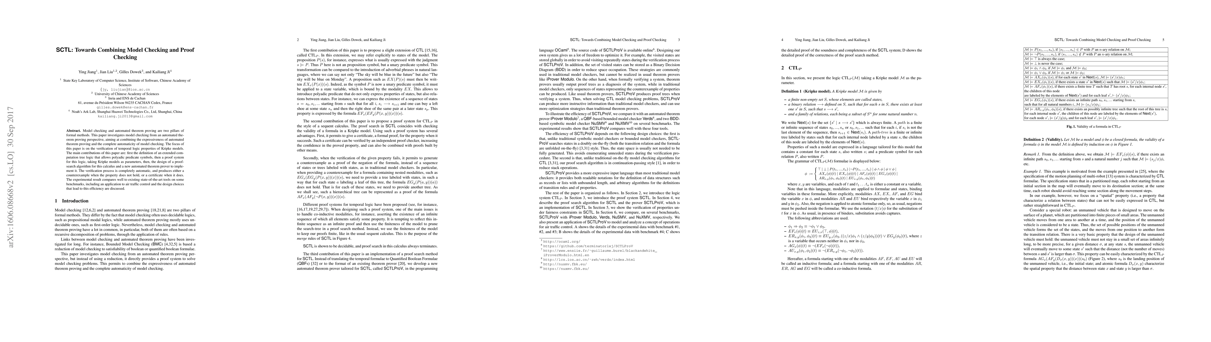 This paper develops an extended computation tree logic to combine model checking with automated theorem proving for verifying temporal logic properties in Kripke models. It introduces a proof system, a proof-search algorithm, and an automated theorem prover, demonstrating efficiency through benchmark tests and applications to air traffic control.