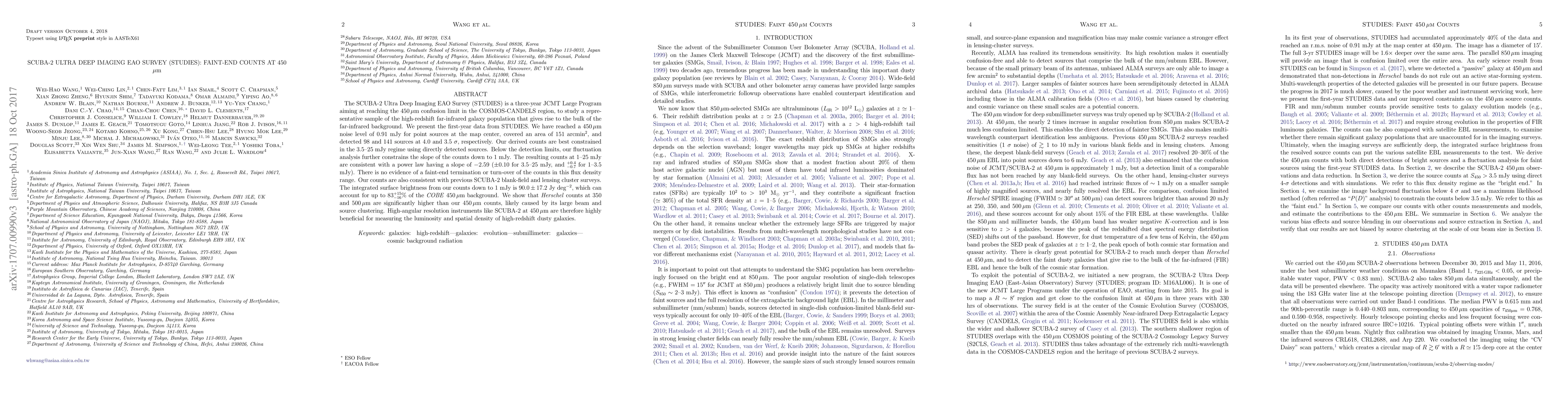 The SCUBA-2 Ultra Deep Imaging EAO Survey (STUDIES) provides faint-end counts at 450 μm, detecting 98 and 141 sources at 4.0 and 3.5 σ respectively, consistent with a power law slope of -2.59, indicating no faint-end turnover and accounting for up to 83% of the COBE 450 μm background.