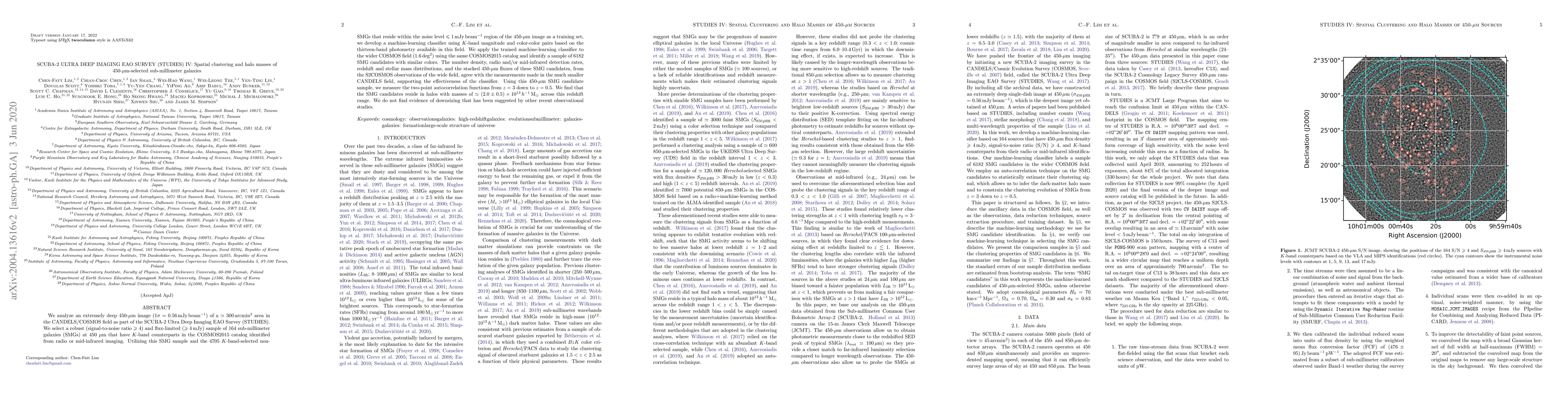 We analyze an extremely deep 450-$\mu$m image ($1\sigma=0.56$\,mJy\,beam$^{-1}$) of a $\simeq 300$\,arcmin$^{2}$ area in the CANDELS/COSMOS field as part of the SCUBA-2 Ultra Deep Imaging EAO Survey (STUDIES). We select a robust (signal-to-noise ratio $\geqslant 4$) and flux-limited ($\geqslant 4$\,mJy) sample of 164 sub-millimeter galaxies (SMGs) at 450-$\mu$m that have $K$-band counterparts in the COSMOS2015 catalog identified from radio or mid-infrared imaging. Utilizing this SMG sample and the 4705 $K$-band-selected non-SMGs that reside within the noise level $\leqslant 1$\,mJy\,beam$^{-1}$ region of the 450-$\mu$m image as a training set, we develop a machine-learning classifier using $K$-band magnitude and color-color pairs based on the thirteen-band photometry available in this field. We apply the trained machine-learning classifier to the wider COSMOS field (1.6\,deg$^{2}$) using the same COSMOS2015 catalog and identify a sample of 6182 450-$\mu$m SMG candidates with similar colors. The number density, radio and/or mid-infrared detection rates, redshift and stellar mass distributions, and the stacked 450-$\mu$m fluxes of these SMG candidates, from the S2COSMOS observations of the wide field, agree with the measurements made in the much smaller CANDELS field, supporting the effectiveness of the classifier. Using this 450-$\mu$m SMG candidate sample, we measure the two-point autocorrelation functions from $z=3$ down to $z=0.5$. We find that the 450-$\mu$m SMG candidates reside in halos with masses of $\simeq (2.0\pm0.5) \times10^{13}\,h^{-1}\,\rm M_{\odot}$ across this redshift range. We do not find evidence of downsizing that has been suggested by other recent observational studies.