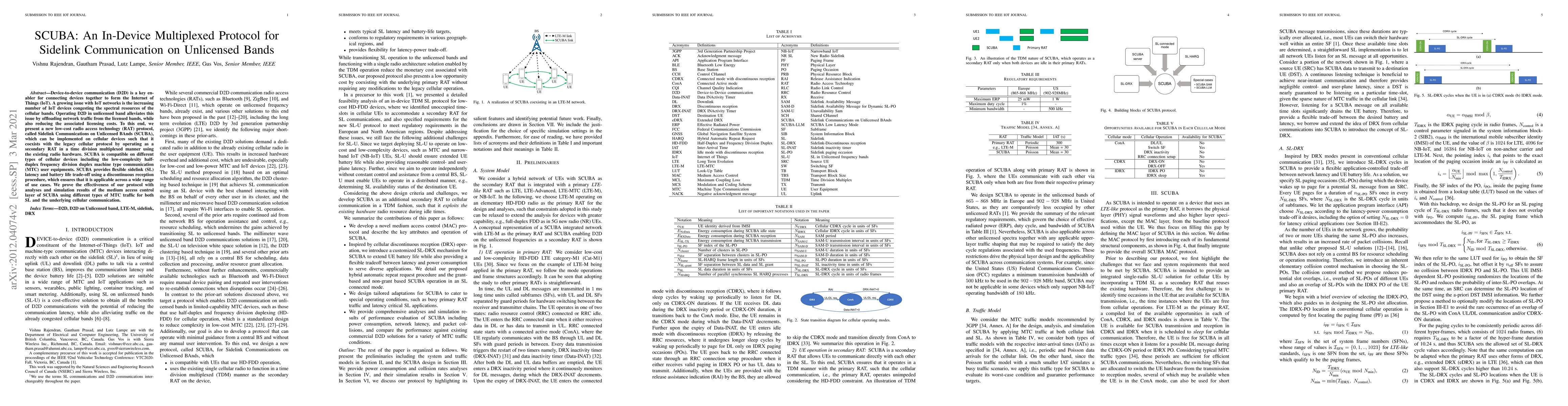 SCUBA is a low-cost protocol for device-to-device communication on unlicensed bands, designed to alleviate congestion in cellular networks and reduce licensing costs. It operates as a secondary RAT in a time division duplex manner, providing flexible latency and battery life tradeoffs suitable for various IoT use cases.