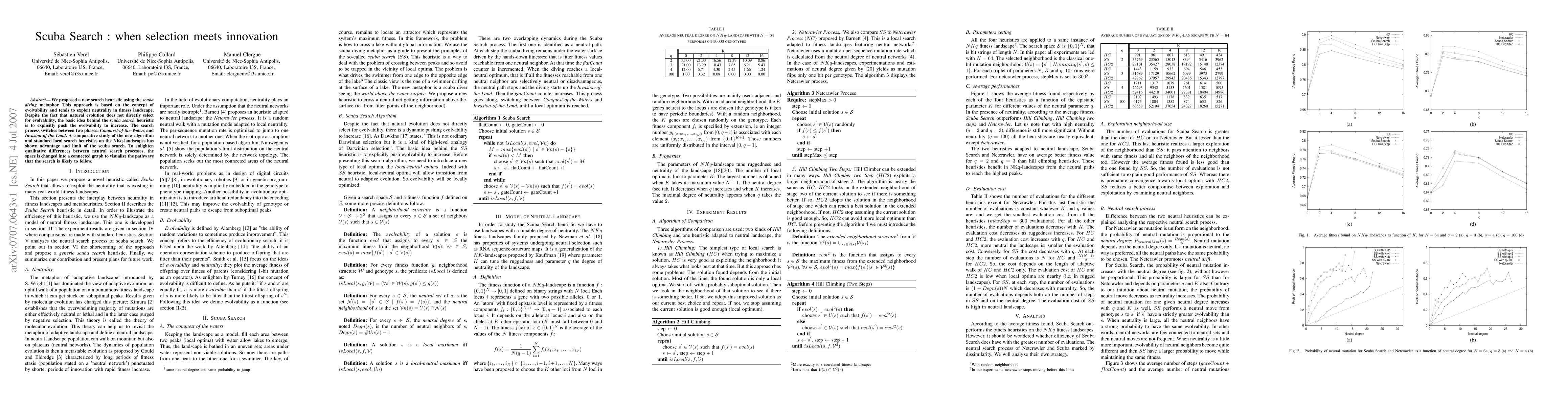 We proposed a new search heuristic using the scuba diving metaphor. This approach is based on the concept of evolvability and tends to exploit neutrality in fitness landscape. Despite the fact that natural evolution does not directly select for evolvability, the basic idea behind the scuba search heuristic is to explicitly push the evolvability to increase. The search process switches between two phases: Conquest-of-the-Waters and Invasion-of-the-Land. A comparative study of the new algorithm and standard local search heuristics on the NKq-landscapes has shown advantage and limit of the scuba search. To enlighten qualitative differences between neutral search processes, the space is changed into a connected graph to visualize the pathways that the search is likely to follow.