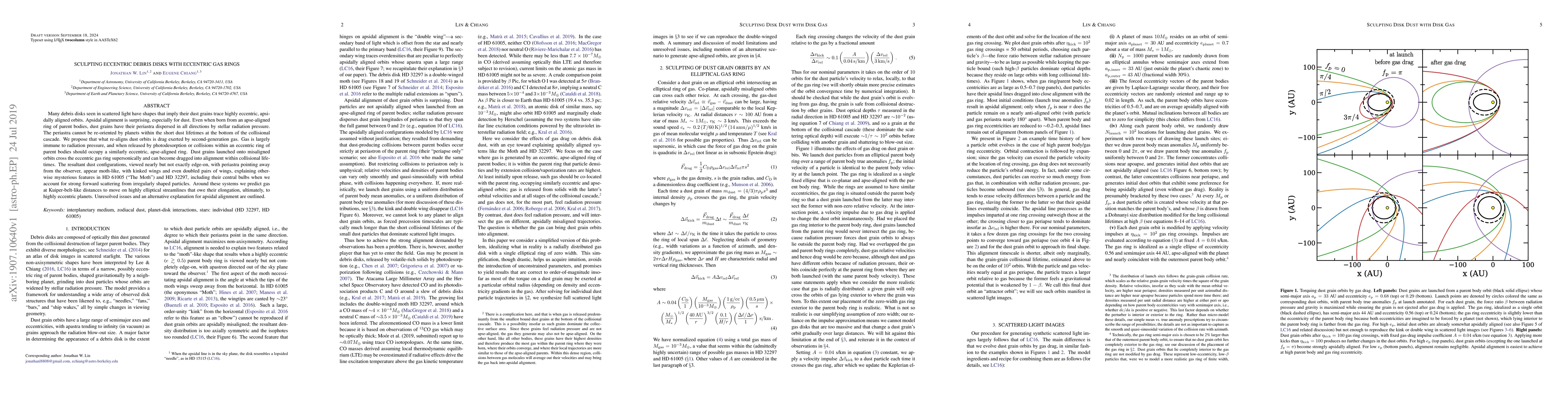 Many debris disks seen in scattered light have shapes that imply their dust grains trace highly eccentric, apsidally aligned orbits. Apsidal alignment is surprising, especially for dust. Even when born from an apse-aligned ring of parent bodies, dust grains have their periastra dispersed in all directions by stellar radiation pressure. The periastra cannot be re-oriented by planets within the short dust lifetimes at the bottom of the collisional cascade. We propose that what re-aligns dust orbits is drag exerted by second-generation gas. Gas is largely immune to radiation pressure, and when released by photodesorption or collisions within an eccentric ring of parent bodies should occupy a similarly eccentric, apse-aligned ring. Dust grains launched onto misaligned orbits cross the eccentric gas ring supersonically and can become dragged into alignment within collisional lifetimes. The resultant dust configurations, viewed nearly but not exactly edge-on, with periastra pointing away from the observer, appear moth-like, with kinked wings and even doubled pairs of wings, explaining otherwise mysterious features in HD 61005 ("The Moth") and HD 32297, including their central bulbs when we account for strong forward scattering from irregularly shaped particles. Around these systems we predict gas at Kuiper-belt-like distances to move on highly elliptical streamlines that owe their elongation, ultimately, to highly eccentric planets. Unresolved issues and an alternative explanation for apsidal alignment are outlined.