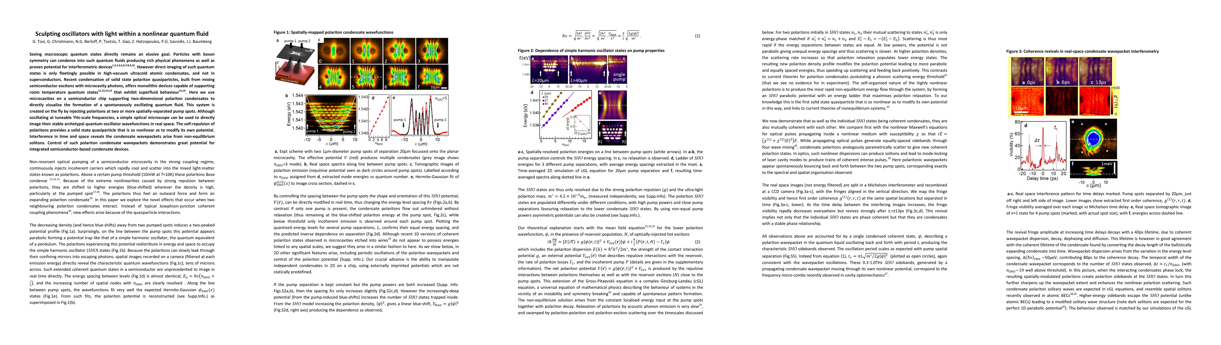 Seeing macroscopic quantum states directly remains an elusive goal. Particles with boson symmetry can condense into such quantum fluids producing rich physical phenomena as well as proven potential for interferometric devices [1-10]. However direct imaging of such quantum states is only fleetingly possible in high-vacuum ultracold atomic condensates, and not in superconductors. Recent condensation of solid state polariton quasiparticles, built from mixing semiconductor excitons with microcavity photons, offers monolithic devices capable of supporting room temperature quantum states [11-14] that exhibit superfluid behaviour [15,16]. Here we use microcavities on a semiconductor chip supporting two-dimensional polariton condensates to directly visualise the formation of a spontaneously oscillating quantum fluid. This system is created on the fly by injecting polaritons at two or more spatially-separated pump spots. Although oscillating at tuneable THz-scale frequencies, a simple optical microscope can be used to directly image their stable archetypal quantum oscillator wavefunctions in real space. The self-repulsion of polaritons provides a solid state quasiparticle that is so nonlinear as to modify its own potential. Interference in time and space reveals the condensate wavepackets arise from non-equilibrium solitons. Control of such polariton condensate wavepackets demonstrates great potential for integrated semiconductor-based condensate devices.