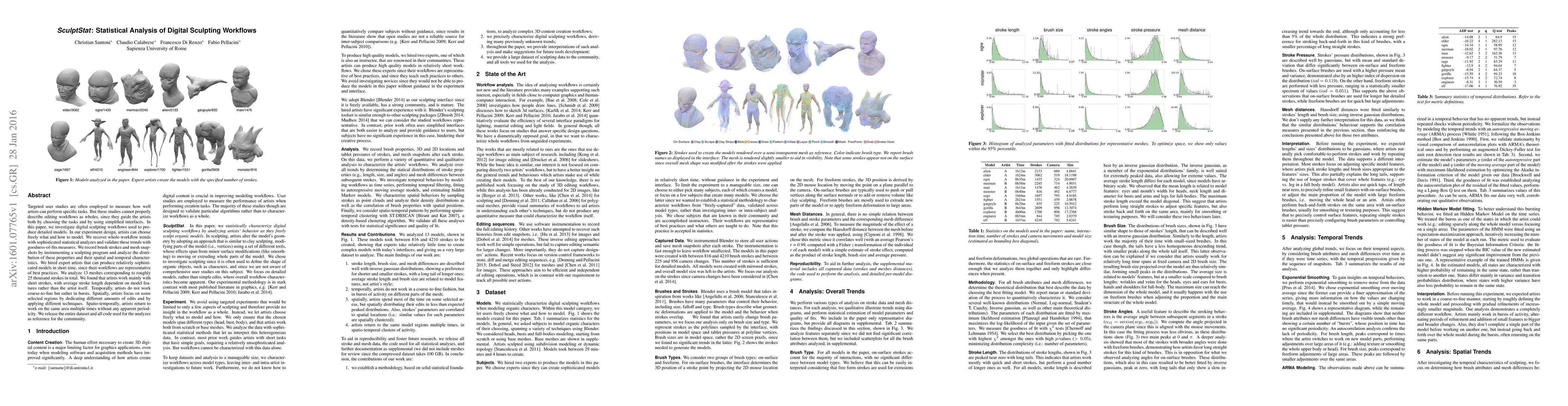 This paper investigates digital sculpting workflows by allowing artists to model freely. Key findings include artists using short strokes, working in temporal bursts, focusing on specific model regions, and revisiting areas without periodicity. The study releases datasets and code for community reference.