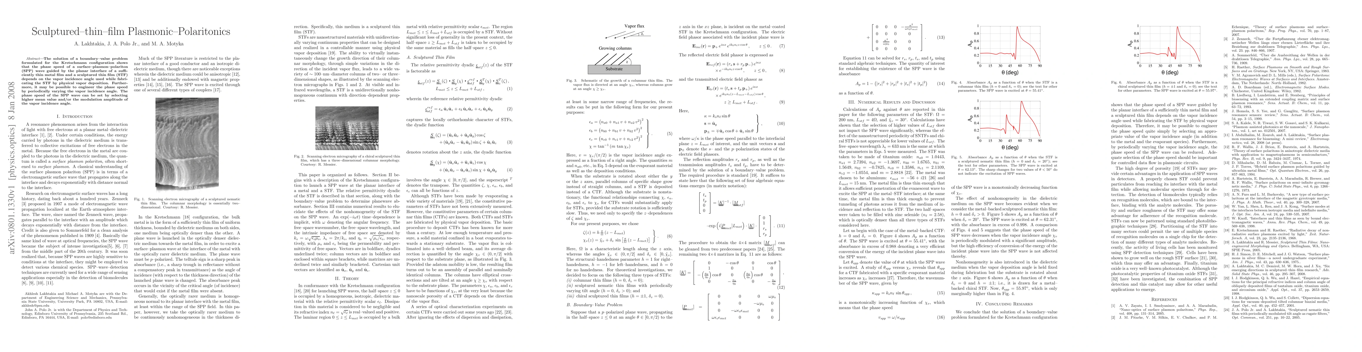 The solution of a boundary--value problem formulated for the Kretschmann configuration shows that the phase speed of a surface--plasmon--polariton (SPP) wave guided by the planar interface of a sufficiently thin metal film and a sculptured thin film (STF) depends on the vapor incidence angle used while fabricating the STF by physical vapor deposition. Furthermore, it may be possible to engineer the phase speed by periodically varying the vapor incidence angle. The phase speed of the SPP wave can be set by selecting higher mean value and/or the modulation amplitude of the vapor incidence angle.