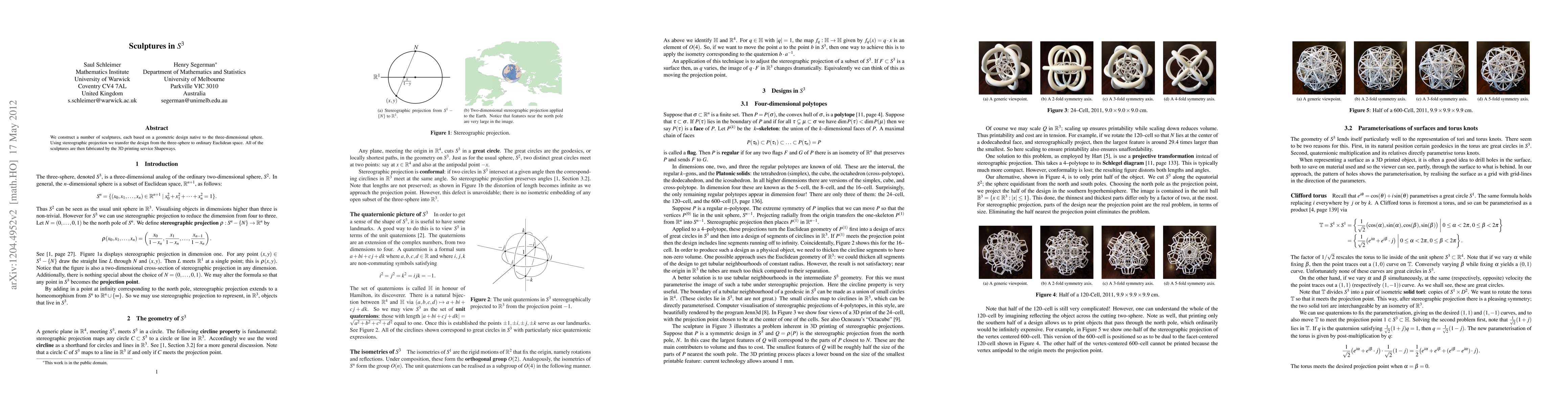We construct a number of sculptures, each based on a geometric design native to the three-dimensional sphere. Using stereographic projection we transfer the design from the three-sphere to ordinary Euclidean space. All of the sculptures are then fabricated by the 3D printing service Shapeways.