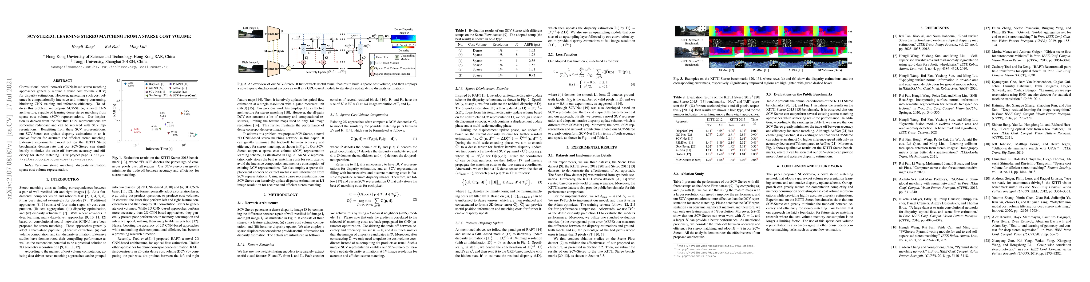The SCV-Stereo architecture proposes a novel CNN-based approach for stereo matching that utilizes sparse cost volume representations instead of dense ones, significantly improving computational efficiency and memory usage while maintaining accuracy, as demonstrated on the KITTI dataset.