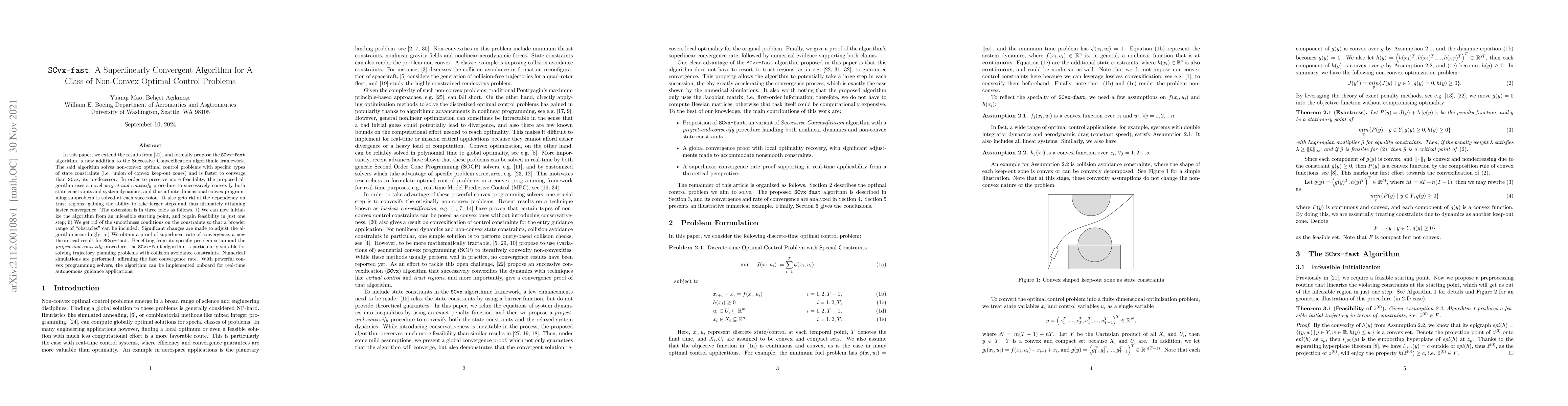 The SCvx-fast algorithm is a superlinearly convergent method for solving non-convex optimal control problems with state constraints, offering faster convergence than its predecessor SCvx. It achieves this through a novel project-and-convexify procedure and eliminates the need for trust regions, enabling larger steps and broader applicability.