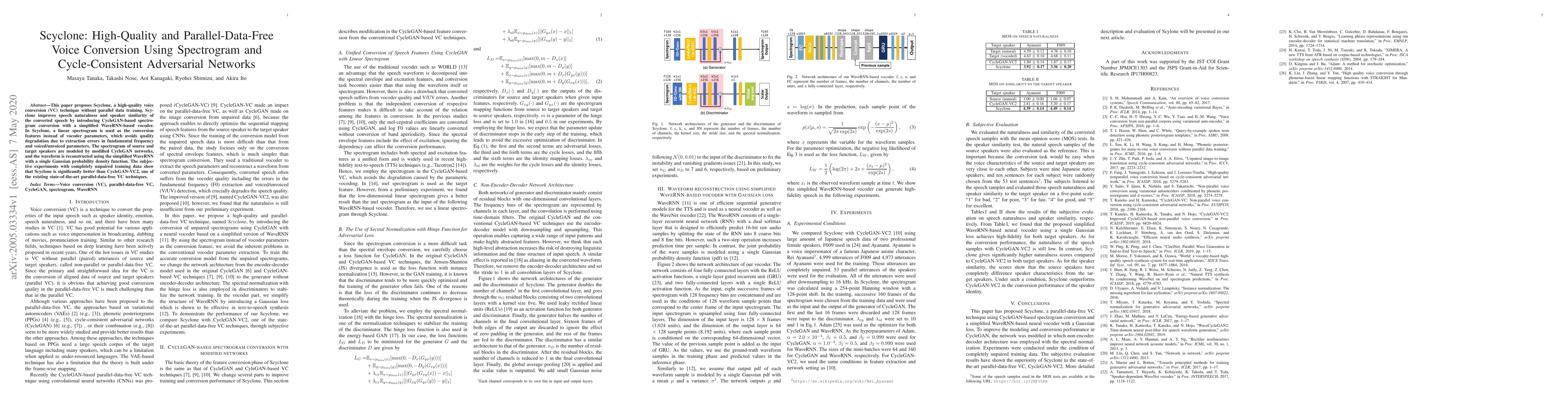 Scyclone presents a novel voice conversion technique that achieves high-quality results without parallel data training, utilizing CycleGAN-based spectrogram conversion and a simplified WaveRNN vocoder for natural speech and speaker similarity. Subjective experiments demonstrate Scyclone's superior performance compared to existing parallel-data-free methods.