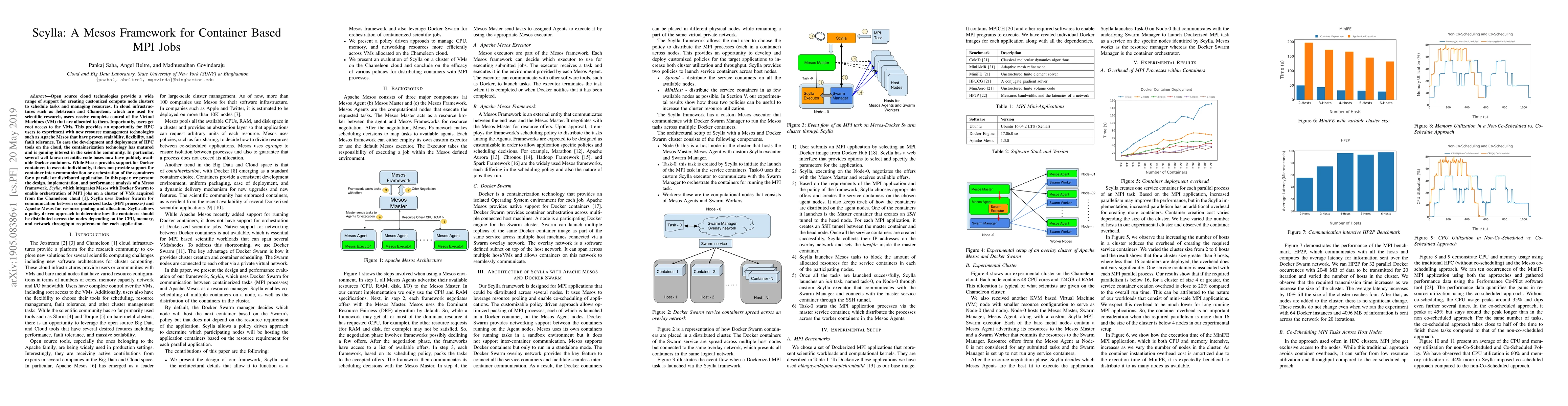 Open source cloud technologies provide a wide range of support for creating customized compute node clusters to schedule tasks and managing resources. In cloud infrastructures such as Jetstream and Chameleon, which are used for scientific research, users receive complete control of the Virtual Machines (VM) that are allocated to them. Importantly, users get root access to the VMs. This provides an opportunity for HPC users to experiment with new resource management technologies such as Apache Mesos that have proven scalability, flexibility, and fault tolerance. To ease the development and deployment of HPC tools on the cloud, the containerization technology has matured and is gaining interest in the scientific community. In particular, several well known scientific code bases now have publicly available Docker containers. While Mesos provides support for Docker containers to execute individually, it does not provide support for container inter-communication or orchestration of the containers for a parallel or distributed application. In this paper, we present the design, implementation, and performance analysis of a Mesos framework, Scylla, which integrates Mesos with Docker Swarm to enable orchestration of MPI jobs on a cluster of VMs acquired from the Chameleon cloud [1]. Scylla uses Docker Swarm for communication between containerized tasks (MPI processes) and Apache Mesos for resource pooling and allocation. Scylla allows a policy-driven approach to determine how the containers should be distributed across the nodes depending on the CPU, memory, and network throughput requirement for each application.