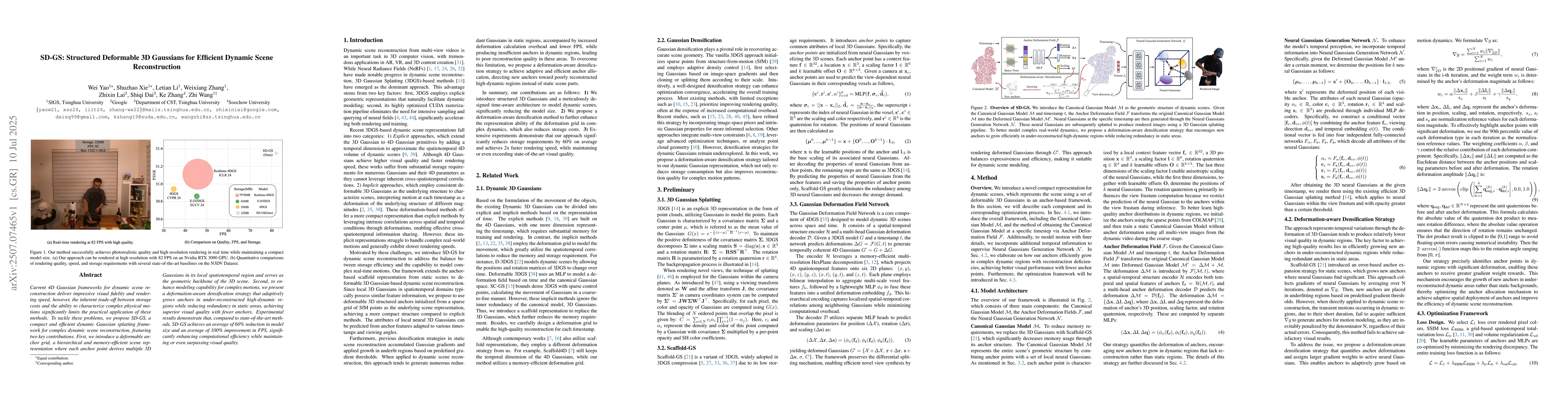 Current 4D Gaussian frameworks for dynamic scene reconstruction deliver impressive visual fidelity and rendering speed, however, the inherent trade-off between storage costs and the ability to characterize complex physical motions significantly limits the practical application of these methods. To tackle these problems, we propose SD-GS, a compact and efficient dynamic Gaussian splatting framework for complex dynamic scene reconstruction, featuring two key contributions. First, we introduce a deformable anchor grid, a hierarchical and memory-efficient scene representation where each anchor point derives multiple 3D Gaussians in its local spatiotemporal region and serves as the geometric backbone of the 3D scene. Second, to enhance modeling capability for complex motions, we present a deformation-aware densification strategy that adaptively grows anchors in under-reconstructed high-dynamic regions while reducing redundancy in static areas, achieving superior visual quality with fewer anchors. Experimental results demonstrate that, compared to state-of-the-art methods, SD-GS achieves an average of 60\% reduction in model size and an average of 100\% improvement in FPS, significantly enhancing computational efficiency while maintaining or even surpassing visual quality.