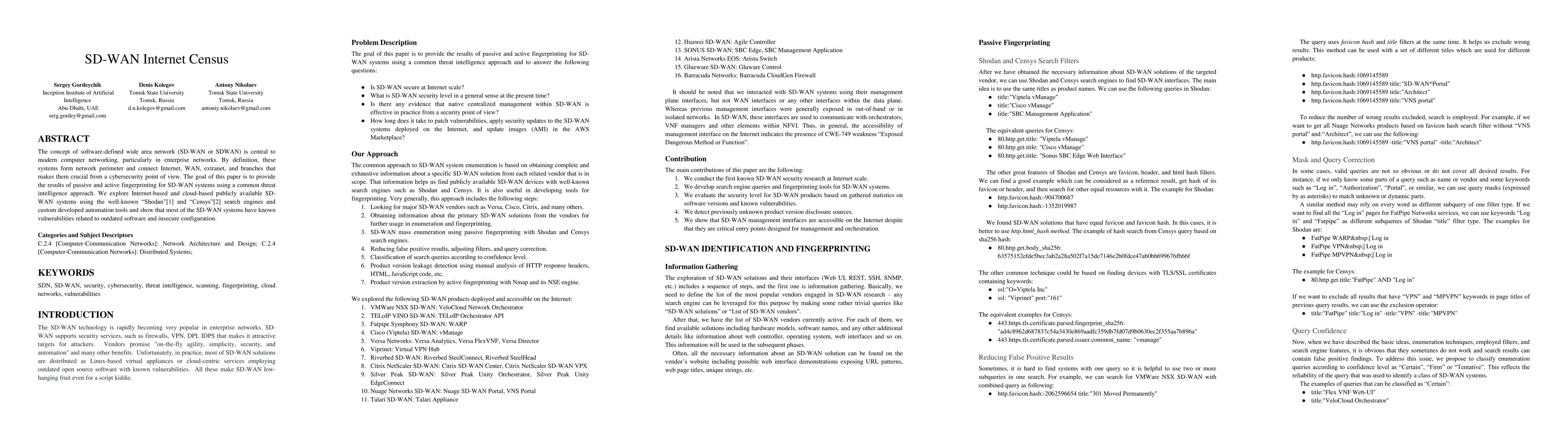 This paper presents findings from a census of publicly accessible SD-WAN systems using threat intelligence methods, revealing widespread vulnerabilities due to outdated software and insecure configurations. The study leverages Shodan and Censys search engines and custom tools to identify these issues.