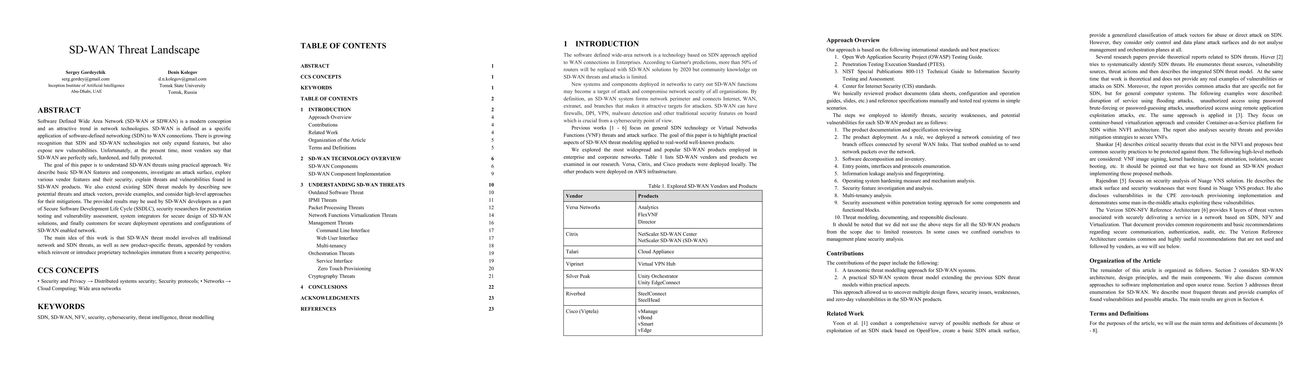 This paper investigates the security threats associated with Software Defined Wide Area Network (SD-WAN) technologies, identifying both traditional and new vulnerabilities. It provides a comprehensive threat model and mitigation strategies for developers, researchers, and system integrators to enhance SD-WAN security.
