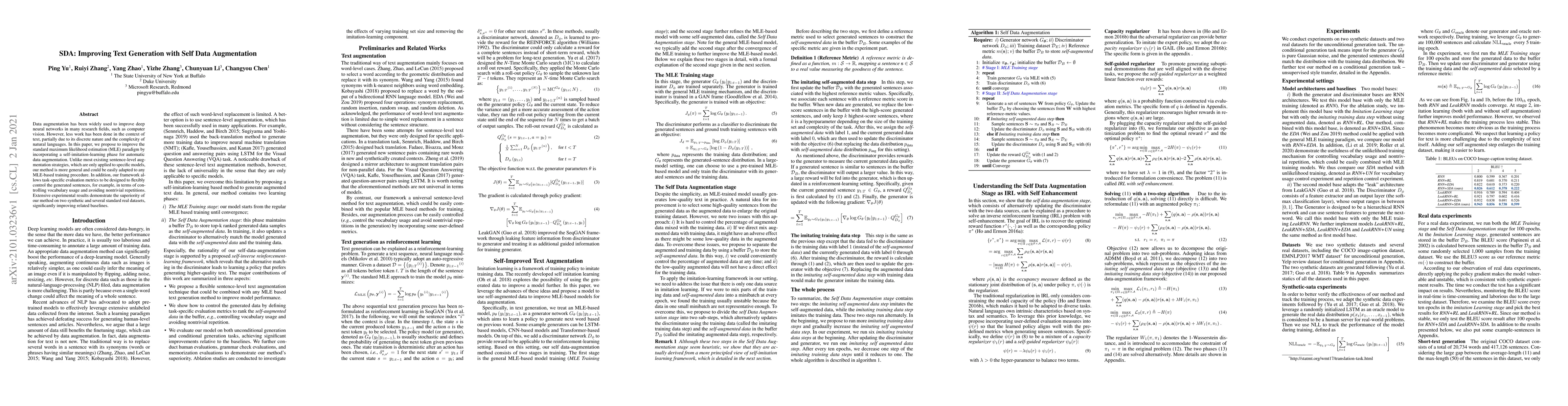 This paper proposes a self-data augmentation (SDA) method to improve text generation by incorporating self-imitation-learning for automatic data augmentation, which is adaptable to any maximum likelihood estimation-based training procedure. Experimental results show significant improvements over baselines on various datasets.