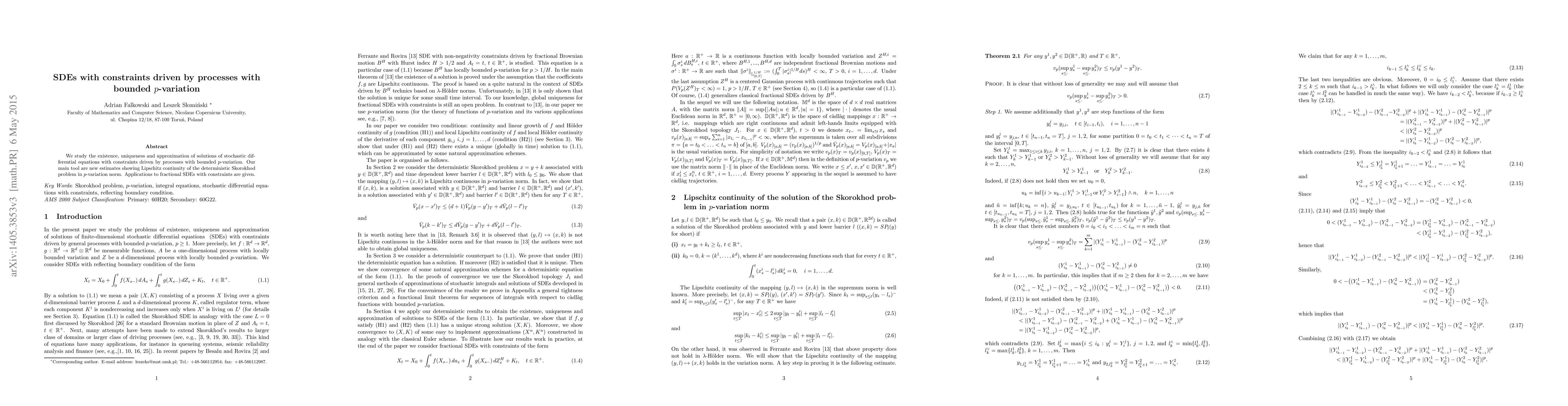 We study the existence, uniqueness and approximation of solutions of stochastic differential equations with constraints driven by processes with bounded p-variation. Our main tool are new estimates showing Lipschitz continuity of the deterministic Skorokhod problem in p-variation norm. Applications to fractional SDEs with constraints are given.