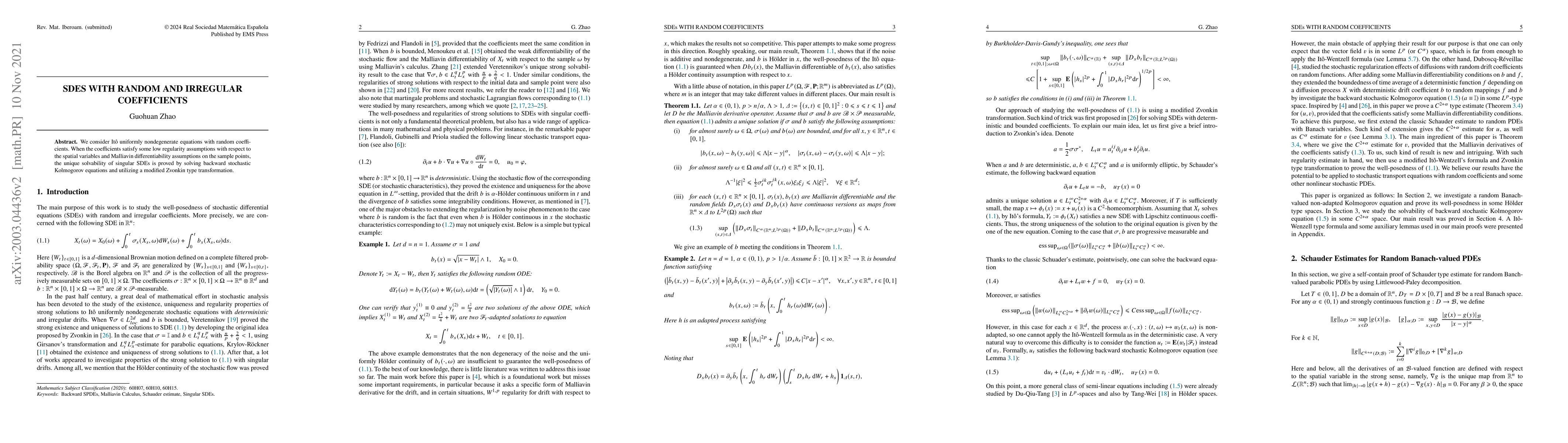 We consider It\^o uniformly nondegenerate equations with random coefficients. When the coefficients satisfy some low regularity assumptions with respect to the spatial variables and Malliavin differentiability assumptions on the sample points, the unique solvability of singular SDEs is proved by solving backward stochastic Kolmogorov equations and utilizing a modified Zvonkin type transformation.