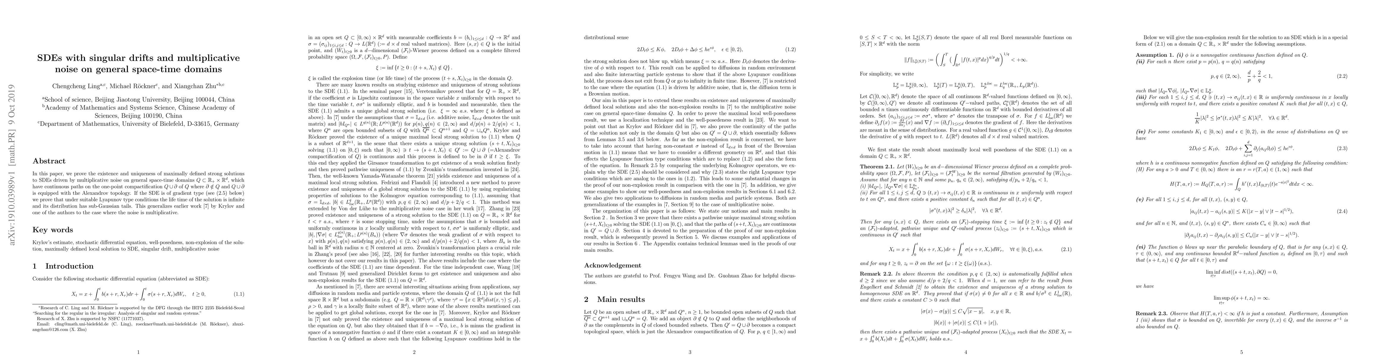 In this paper, we prove the existence and uniqueness of maximally defined strong solutions to SDEs driven by multiplicative noise on general space-time domains $Q\subset\mathbb{R}_+\times\mathbb{R}^d$, which have continuous paths on the one-point compactification $Q\cup\partial$ of $Q$ where $\partial \notin Q$ and $Q\cup\partial$ is equipped with the Alexandrov topology. If the SDE is of gradient type (see (2.5) below) we prove that under suitable Lyapunov type conditions the life time of the solution is infinite and its distribution has sub-Gaussian tails. This generalizes earlier work \cite{KR} by Krylov and one of the authors to the case where the noise is multiplicative.