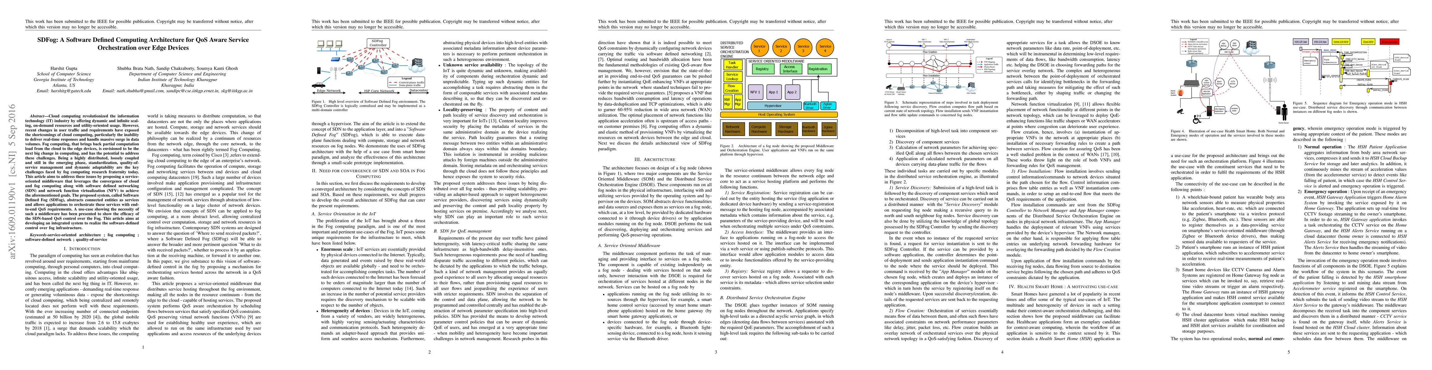 The paper proposes SDFog, a software-defined computing architecture that integrates cloud and fog computing with SDN and NFV to manage QoS and standardize service orchestration over edge devices. It aims to address real-time response and surge data volume challenges by leveraging dynamic adaptability and QoS-aware service orchestration.