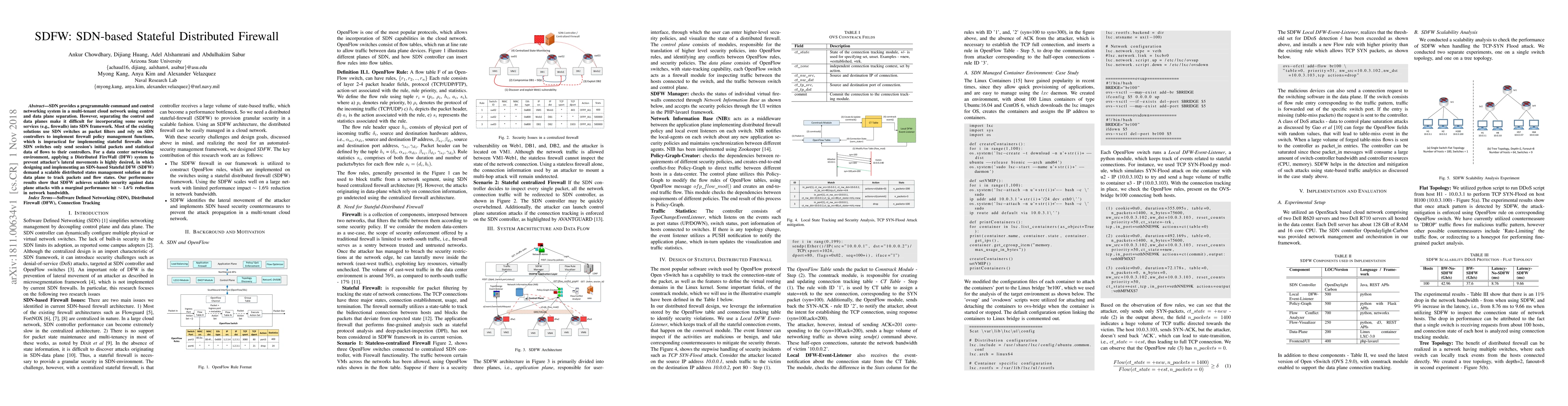 SDN provides a programmable command and control networking system in a multi-tenant cloud network using control and data plane separation. However, separating the control and data planes make it difficult for incorporating some security services (e.g., firewalls) into SDN framework. Most of the existing solutions use SDN switches as packet filters and rely on SDN controllers to implement firewall policy management functions, which is impractical for implementing stateful firewalls since SDN switches only send session's initial packets and statistical data of flows to their controllers. For a data center networking environment, applying a Distributed FireWall (DFW) system to prevent attacker's lateral movements is highly desired, in which designing and implementing an SDN-based Stateful DFW (SDFW) demand a scalable distributed states management solution at the data plane to track packets and flow states. Our performance results show that SDFW achieves scalable security against data plane attacks with a marginal performance hit ~ 1.6% reduction in network bandwidth.