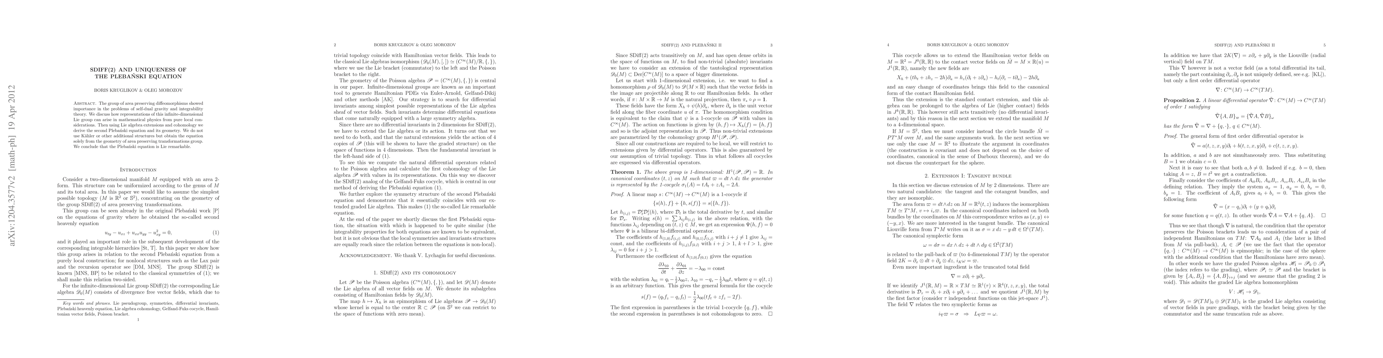 The group of area preserving diffeomorphisms showed importance in the problems of self-dual gravity and integrability theory. We discuss how representations of this infinite-dimensional Lie group can arise in mathematical physics from pure local considerations. Then using Lie algebra extensions and cohomology we derive the second Pleba\'{n}ski equation and its geometry. We do not use K\"ahler or other additional structures but obtain the equation solely from the geometry of area preserving transformations group. We conclude that the Pleba\'{n}ski equation is Lie remarkable.
