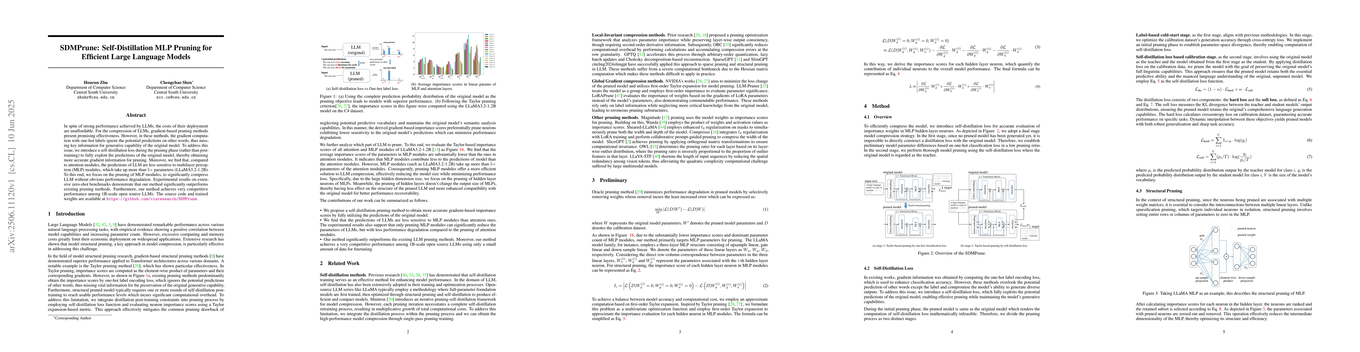 The paper introduces SDMPrune, a self-distillation MLP pruning method for efficient large language models. It employs a self-distillation loss during the pruning phase to exploit the original model's predictions, obtaining more accurate gradient information for pruning. The method focuses on MLP modules, which take up more parameters in models like LLaMA3.2-1.2B.