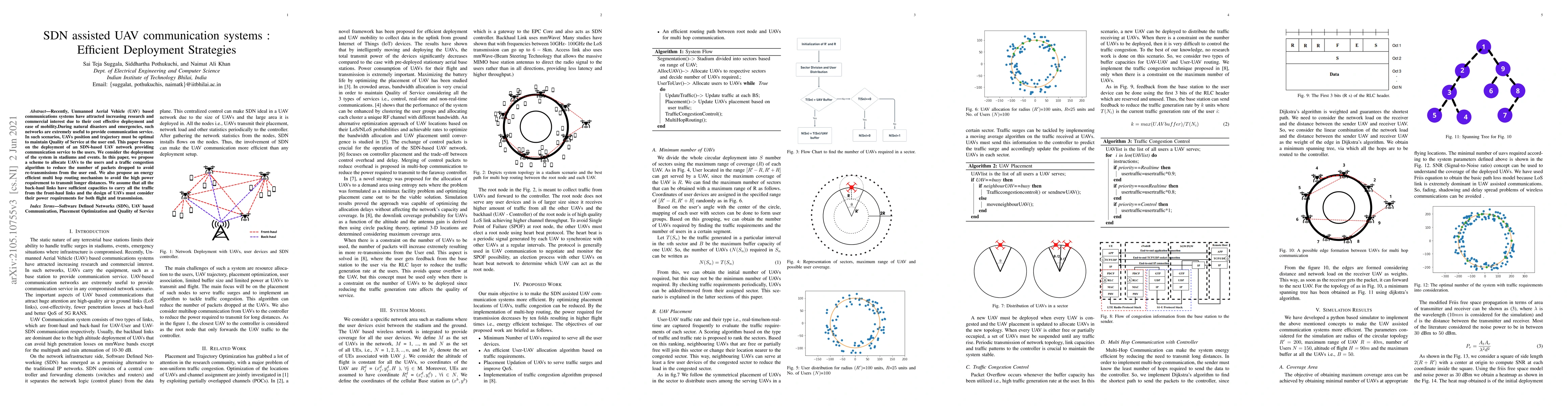 Recently, Unmanned Aerial Vehicle (UAV) based communications systems have attracted increasing research and commercial interest due to their cost effective deployment and ease of mobility.During natural disasters and emergencies, such networks are extremely useful to provide communication service. In such scenarios, UAVs position and trajectory must be optimal to maintain Quality of Service at the user end. This paper focuses on the deployment of an SDN-based UAV network providing communication service to the users. We consider the deployment of the system in stadiums and events. In this paper, we propose a scheme to allocate UAVs to the users and a traffic congestion algorithm to reduce the number of packets dropped to avoid re-transmissions from the user end. We also propose an energy efficient multi hop routing mechanism to avoid the high power requirement to transmit longer distances. We assume that all the back-haul links have sufficient capacities to carry all the traffic from the front-haul links and the design of UAVs must consider their power requirements for both flight and transmission.