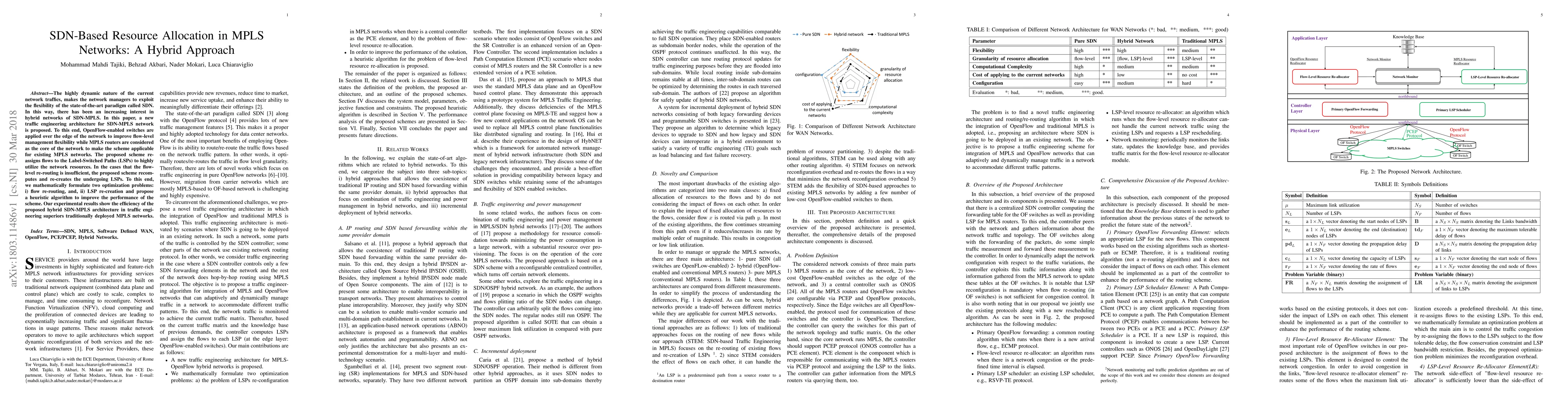 This paper proposes a hybrid SDN-MPLS architecture for traffic engineering that utilizes OpenFlow-enabled switches for edge flow management and MPLS routers for core network compatibility. The scheme optimizes resource allocation through flow re-routing and LSP re-creation, demonstrating superior performance over traditional MPLS networks.