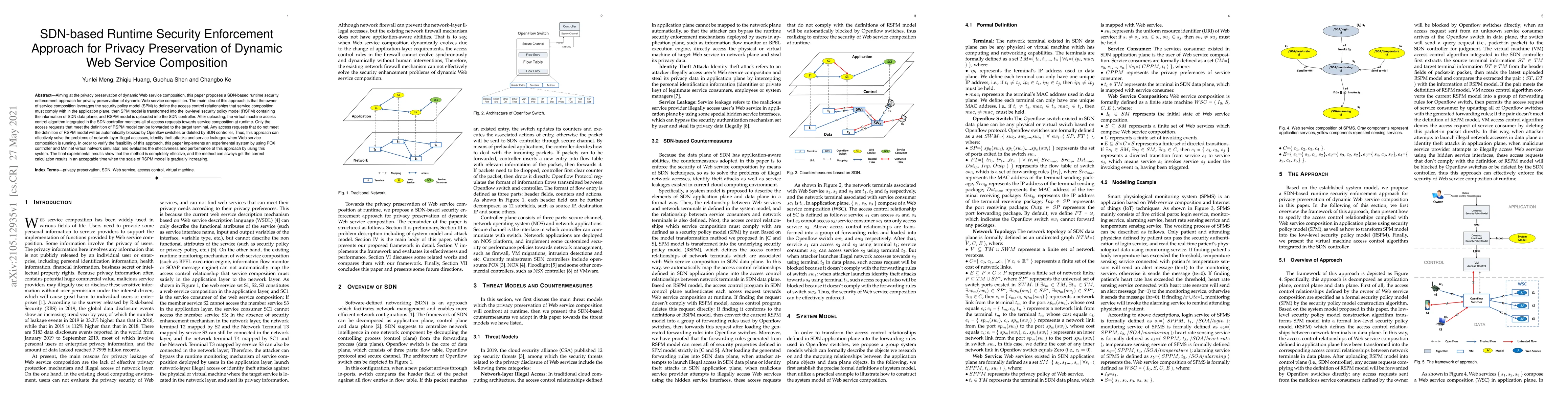 Aiming at the privacy preservation of dynamic Web service composition, this paper proposes a SDN-based runtime security enforcement approach for privacy preservation of dynamic Web service composition. The main idea of this approach is that the owner of service composition leverages the security policy model (SPM) to define the access control relationships that service composition must comply with in the application plane, then SPM model is transformed into the low-level security policy model (RSPM) containing the information of SDN data plane, and RSPM model is uploaded into the SDN controller. After uploading, the virtual machine access control algorithm integrated in the SDN controller monitors all of access requests towards service composition at runtime. Only the access requests that meet the definition of RSPM model can be forwarded to the target terminal. Any access requests that do not meet the definition of RSPM model will be automatically blocked by Openflow switches or deleted by SDN controller, Thus, this approach can effectively solve the problems of network-layer illegal accesses, identity theft attacks and service leakages when Web service composition is running. In order to verify the feasibility of this approach, this paper implements an experimental system by using POX controller and Mininet virtual network simulator, and evaluates the effectiveness and performance of this approach by using this system. The final experimental results show that the method is completely effective, and the method can always get the correct calculation results in an acceptable time when the scale of RSPM model is gradually increasing.