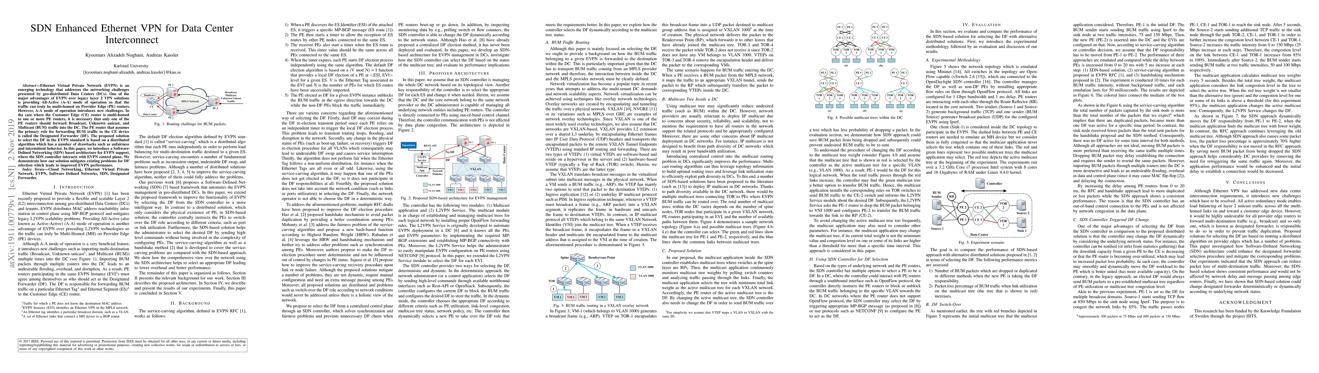 Ethernet Virtual Private Network (EVPN) is an emerging technology that addresses the networking challenges presented by geo-distributed Data Centers (DCs). One of the major advantages of EVPN over legacy layer 2 VPN solutions is providing All-Active (A-A) mode of operation so that the traffic can truly be multi-homed on Provider Edge (PE) routers. However, A-A mode of operation introduces new challenges. In the case where the Customer Edge (CE) router is multi-homed to one or more PE routers, it is necessary that only one of the PE routers should forward Broadcast, Unknown unicast, and Multicast (BUM) traffic into the DC. The PE router that assumes the primary role for forwarding BUM traffic to the CE device is called the Designated Forwarder (DF). The proposed solution to select the DF in the EVPN standard is based on a distributed algorithm which has a number of drawbacks such as unfairness and intermittent behavior. In this paper, we introduce a Software-Defined Networking (SDN) based architecture for EVPN support, where the SDN controller interacts with EVPN control plane. We demonstrate how our solution mitigates existing problems for DF selection which leads to improved EVPN performance.