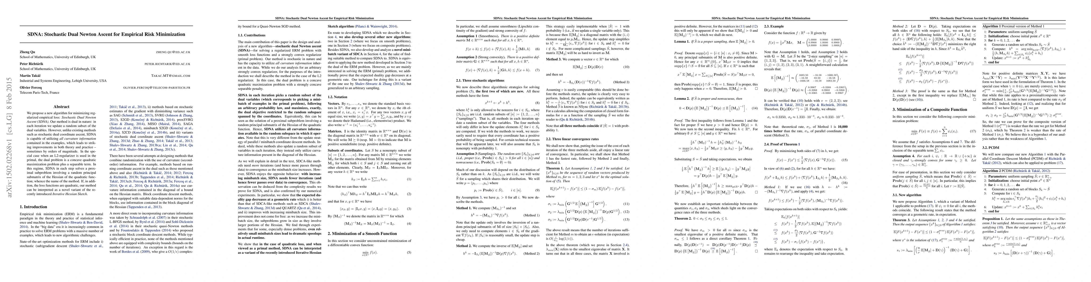 The paper introduces Stochastic Dual Newton Ascent (SDNA), a dual-based algorithm that updates a random subset of dual variables to minimize regularized empirical loss, leveraging full curvature information to achieve significant improvements over existing methods. The method solves a proximal subproblem with a random principal submatrix of the Hessian, especially effective when L2-regularization and quadratic loss functions are used.